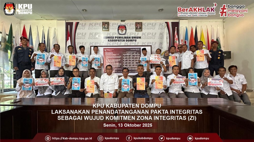 KPU Kabupaten Dompu Laksanakan Penandatanganan Pakta Integritas Sebagai Wujud Komitmen Zona Integritas Dompu — Komisi Pemilihan Umum (KPU) Kabupaten Dompu melaksanakan kegiatan penandatanganan Pakta Integritas, sebagai bentuk komitmen bersama dalam mewujudkan penyelenggaraan lembaga yang bersih, transparan, dan berintegritas. Kegiatan tersebut berlangsung di Aula KPU Kabupaten Dompu pada Senin (13/10/2025), dihadiri oleh Ketua, Anggota, Sekretaris, serta seluruh jajaran Sekretariat KPU Kabupaten Dompu. Ketua KPU Kabupaten Dompu dalam sambutannya menyampaikan bahwa penandatanganan pakta integritas ini merupakan langkah nyata dalam membangun budaya kerja berintegritas dan berorientasi pada pelayanan publik yang berkualitas. “Melalui penandatanganan pakta integritas ini, kita semua berkomitmen untuk menjunjung tinggi nilai kejujuran, tanggung jawab, serta profesionalitas dalam setiap pelaksanaan tugas dan fungsi kelembagaan,” ujarnya. Kegiatan ini juga menjadi bagian dari implementasi pembangunan Zona Integritas (ZI) menuju Wilayah Bebas dari Korupsi (WBK) di lingkungan KPU Kabupaten Dompu. Sekretaris KPU Kabupaten Dompu Lahmuddin menambahkan bahwa seluruh jajaran diharapkan dapat menjaga konsistensi dan komitmen bersama dalam menjalankan nilai-nilai integritas. “Komitmen ini bukan hanya formalitas, tetapi harus tercermin dalam perilaku kerja sehari-hari. Integritas adalah fondasi utama dalam mewujudkan kepercayaan publik terhadap KPU,” tegasnya. Dengan terselenggaranya kegiatan ini, KPU Kabupaten Dompu menegaskan tekadnya untuk terus memperkuat tata kelola pemerintahan yang baik, akuntabel, dan bebas dari praktik korupsi, kolusi, serta nepotisme. #KpuMelayani #KpuKabupatenDompu ....