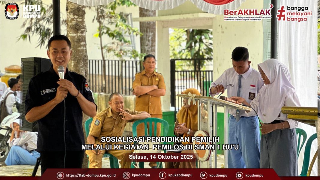 Dompu – Dalam upaya meningkatkan kesadaran berdemokrasi di kalangan pelajar, Komisi Pemilihan Umum (KPU) Kabupaten Dompu melalui Kadiv. Sosialisasi, Pendidikan Pemilih, Parmas, dan SDM Yusuf juga bersama Kadiv. Hukum dan Pengawasan Maman Apriansyah melaksanakan kegiatan Sosialisasi Pendidikan Pemilih pada acara debat calon Ketua dan Wakil Ketua OSIS di SMAN 1 Hu’u, Selasa (14/10/2025). Kegiatan ini diikuti dengan antusias oleh seluruh siswa dan guru SMAN 1 Hu’u. Melalui kesempatan ini, Kadiv. Sosialisasi Pendidikan Pemilih Parmas Dan SDM KPU Kabupaten Dompu menyampaikan materi tentang pentingnya partisipasi dalam pemilihan, nilai-nilai demokrasi, serta tata cara pemilihan yang jujur, adil, dan berintegritas. Dijelaskannya bahwa kegiatan ini merupakan bagian dari program pendidikan pemilih bagi segmen pemilih pemula, dengan tujuan menumbuhkan kesadaran sejak dini tentang arti pentingnya suara dalam setiap proses demokrasi. “Pemilihan Ketua OSIS adalah miniatur dari pemilihan umum. Melalui kegiatan ini, adik-adik dapat belajar bagaimana memilih pemimpin yang memiliki visi dan komitmen untuk memajukan sekolah,” ujar Yusuf. Selain memberikan sosialisasi, KPU Kabupaten Dompu juga terus mendorong agar pelaksanaan pemilihan Ketua OSIS dapat menerapkan prinsip-prinsip demokrasi seperti keterbukaan, kejujuran, dan tanggung jawab. Kegiatan ini diharapkan dapat menjadi sarana edukasi politik bagi para pelajar agar kelak menjadi pemilih cerdas dan berintegritas dalam setiap pemilu maupun kegiatan demokrasi di lingkungan mereka. ....