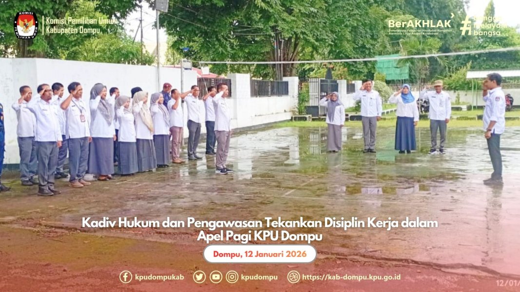 #TemanPemilih.Komisi Pemilihan Umum (KPU) Kabupaten Dompu melaksanakan apel pagi pada Senin, (12/1/2026), bertempat di Halaman Kantor KPU Kabupaten Dompu, Jalan Bhayangkara Nomor 06. Apel ini menjadi momentum penguatan komitmen kedisiplinan seluruh jajaran sekretariat dalam mendukung kinerja kelembagaan. Apel pagi tersebut dipimpin oleh Kadiv. Hukum dan Pengawasan KPU Kabupaten Dompu, Maman Apriansyah, serta dihadiri oleh Sekretaris KPU Kabupaten Dompu, Lahmuddin, para Kasubbag, dan seluruh staf sekretariat. Dalam arahannya, Maman Apriansyah menekankan pentingnya peningkatan disiplin kerja, baik disiplin waktu masuk dan pulang kerja, maupun disiplin dalam menghasilkan output kinerja yang berkualitas dan terukur. “Disiplin bukan hanya soal kehadiran tepat waktu, tetapi juga bagaimana setiap tugas yang kita emban mampu menghasilkan output kerja yang maksimal, profesional, dan bertanggung jawab,” tegas Maman. Ia menambahkan bahwa budaya kerja yang disiplin merupakan fondasi utama dalam membangun kredibilitas dan kepercayaan publik terhadap lembaga penyelenggara pemilu. “KPU adalah lembaga publik. Setiap perilaku dan kinerja kita mencerminkan wajah institusi. Oleh karena itu, disiplin harus menjadi karakter dan komitmen bersama,” ujarnya. Lebih lanjut, Maman mengingatkan bahwa peningkatan kinerja sekretariat tidak dapat dilepaskan dari kesadaran personal setiap pegawai untuk menjaga integritas, etos kerja, serta loyalitas terhadap tugas dan fungsi kelembagaan. Apel pagi tersebut berlangsung dengan tertib dan penuh khidmat, sekaligus menjadi sarana konsolidasi internal dalam memperkuat soliditas dan profesionalitas aparatur KPU Kabupaten Dompu dalam mengawal seluruh tahapan demokrasi. ....