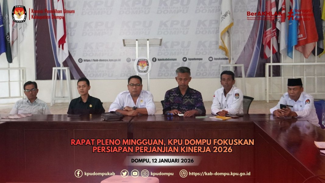 #TemanPemilih. Komisi Pemilihan Umum (KPU) Kabupaten Dompu melaksanakan rapat pleno rutin mingguan pada Senin (12/1/2026), yang membahas agenda persiapan pelaksanaan penandatanganan Perjanjian Kinerja Tahun 2026. Rapat yang berlangsung di Ruang Aula KPU Kabupaten Dompu, Jalan Bhayangkara Nomor 06 Dompu tersebut dipimpin langsung oleh Ketua KPU Kabupaten Dompu, Arif Rahman, dan dihadiri oleh para Anggota KPU Kabupaten Dompu, yakni Maman Apriansyah, Yusuf, Hidayatullah, dan Nasarudin, serta Sekretaris KPU Kabupaten Dompu, Lahmuddin, bersama seluruh Kasubbag. Saat membuka rapat, Ketua KPU Kabupaten Dompu Arif Rahman menegaskan bahwa kegiatan ini menjadi bagian penting dalam memastikan kesiapan kelembagaan menghadapi pelaksanaan program dan kegiatan tahun anggaran 2026. “Rapat pleno ini menjadi momentum untuk menyamakan persepsi, memperkuat koordinasi, serta memastikan seluruh perangkat kerja siap menjalankan komitmen kinerja yang akan ditandatangani pada tahun 2026,” tegas Arif Rahman. Senada dengan hal tersebut, Sekretaris KPU Kabupaten Dompu, Lahmuddin, menyampaikan bahwa agenda rapat ini juga menjadi langkah strategis dalam menyiapkan aspek administratif, perencanaan program, serta penguatan sistem kerja seluruh jajaran sekretariat. “Melalui rapat ini, kami memastikan seluruh unsur sekretariat memahami tugas, jadwal, serta target kinerja yang akan dituangkan dalam Perjanjian Kinerja Tahun 2026. Ini menjadi dasar penting dalam menjaga akuntabilitas, efektivitas, dan kesinambungan pelaksanaan program kerja KPU Kabupaten Dompu,” ujar Lahmuddin. Ia menambahkan bahwa kesiapan dokumen perencanaan, kesesuaian anggaran, serta koordinasi lintas bagian menjadi fokus utama pembahasan agar seluruh tahapan kegiatan dapat berjalan sesuai dengan ketentuan dan regulasi yang berlaku. Rapat berlangsung dinamis dengan berbagai masukan dari peserta rapat, khususnya terkait teknis pelaksanaan, pembagian peran, serta penguatan komitmen bersama dalam mendukung suksesnya pelaksanaan Perjanjian Kinerja Tahun 2026 di lingkungan KPU Kabupaten Dompu ....