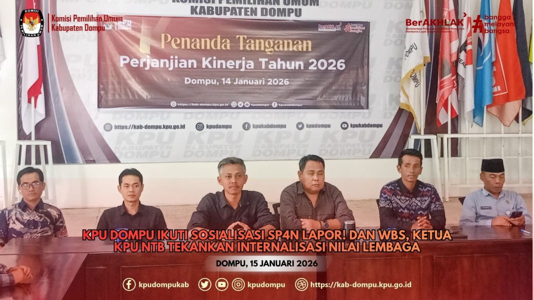 #TemanPemilih. Pada Kamis, (15/1/2026), Komisi Pemilihan Umum (KPU) Kabupaten Dompu mengikuti kegiatan Sosialisasi SP4N LAPOR! dan Whistleblowing System (WBS) yang diselenggarakan oleh KPU Provinsi Nusa Tenggara Barat secara daring melalui aplikasi Zoom Meeting. Kegiatan tersebut diikuti langsung oleh Ketua KPU Kabupaten Dompu, seluruh Anggota KPU Kabupaten Dompu yakni Maman Apriansyah, Yusuf, Hidayatullah, Nasarudin, Sekretaris KPU Kabupaten Dompu Lahmuddin, para Kasubbag, serta seluruh staf Sekretariat KPU Kabupaten Dompu. Kegiatan diawali dengan sambutan Ketua KPU Provinsi NTB, Muhammad Khuwailid, yang menegaskan bahwa sosialisasi ini bukan sekadar penyampaian sistem dan regulasi, tetapi merupakan bagian penting dari proses internalisasi nilai-nilai kelembagaan dalam setiap pelaksanaan tugas dan fungsi penyelenggara pemilu. “Kegiatan ini merupakan upaya internalisasi nilai, bagaimana prinsip-prinsip yang kita pegang sebagai penyelenggara pemilu tidak berhenti sebagai konsep, tetapi benar-benar menjadi tindakan nyata dalam setiap proses kerja kelembagaan,” tegas Muhammad Khuwailid. Ia menambahkan bahwa penerapan SP4N LAPOR! dan WBS merupakan instrumen strategis dalam mewujudkan tata kelola kelembagaan yang bersih, transparan, dan berintegritas. “Sistem ini harus menjadi budaya kerja. Ketika ada indikasi pelanggaran atau penyimpangan, kita memiliki mekanisme yang sah, aman, dan terlindungi untuk melaporkannya,” ujarnya. Setelah sambutan Ketua KPU Provinsi NTB, kegiatan dilanjutkan dengan penyampaian arahan oleh seluruh Anggota KPU Provinsi NTB, yang pada intinya menegaskan komitmen bersama dalam penguatan pengawasan internal, pencegahan pelanggaran, serta peningkatan akuntabilitas di seluruh jajaran KPU Provinsi maupun Kabupaten/Kota se-NTB. Para pimpinan menekankan pentingnya pemahaman menyeluruh terhadap mekanisme SP4N LAPOR! dan WBS sebagai bagian dari sistem pengendalian internal organisasi. Kegiatan kemudian diisi dengan pemaparan materi sosialisasi oleh Sekretaris KPU Provinsi NTB, Mars Ansori Wijaya, yang mengangkat tema “SP4N LAPOR! dan Whistleblowing System (WBS)”. Dalam pemaparannya, Mars Ansori Wijaya menjelaskan secara teknis tentang fungsi SP4N LAPOR! sebagai sarana pengaduan masyarakat serta mekanisme WBS sebagai sistem pelaporan pelanggaran internal yang menjamin kerahasiaan dan perlindungan pelapor. Ia menekankan bahwa keberadaan dua sistem tersebut merupakan instrumen penting dalam mendorong terwujudnya KPU yang bersih, profesional, dan berintegritas tinggi. Melalui kegiatan ini, KPU Kabupaten Dompu menegaskan komitmennya untuk terus memperkuat tata kelola kelembagaan, meningkatkan integritas aparatur, serta memastikan seluruh jajaran memahami dan menerapkan prinsip-prinsip pengawasan internal secara konsisten. Kegiatan sosialisasi berlangsung dengan penuh antusias dan diharapkan mampu meningkatkan pemahaman serta kesadaran seluruh jajaran KPU di wilayah NTB dalam membangun budaya kerja yang transparan dan akuntabel. ....
