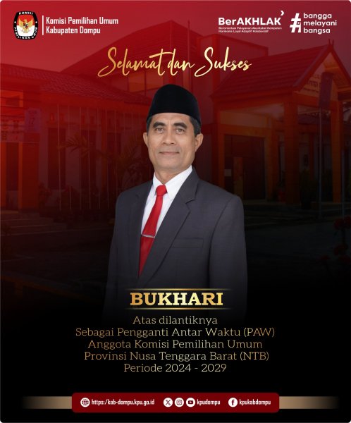 #TemanPemilih. Segenap jajaran Komisi Pemilihan Umum Kabupaten Dompu mengucapkan Selamat Dan Sukses kepada Bukhari atas dilantiknya Sebagai Pengganti Antar Waktu (PAW) Anggota Komisi Pemilihan Umum Provinsi Nusa Tenggara Barat (NTB) Priode 2024 - 2029. ....