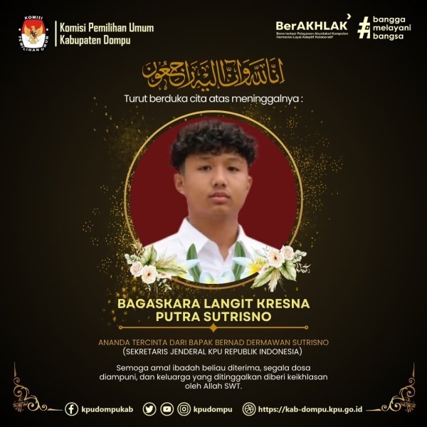 #TemanPemilih. Segenap jajaran Komisi Pemilihan Umum Kabupaten Dompu turut berduka cita yang mendalam atas wafatnya Bagaskara Langit Kresna Putra Sutrisna, ananda tercinta dari Bapak Bernad Dermawan Sutrisno, Sekretaris Jenderal KPU RI. Semoga Amal Ibadah Almarhum Diterima Alla SWT dan Husnul Khotima, serta keluarga yang ditinggalkan diberikan ketabahan, kekuatan, dan keikhlasan. ....
