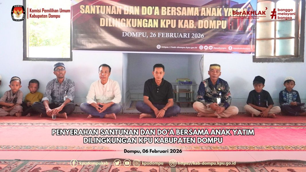 #TemanPemilih. Dalam rangka menumbuhkan kepedulian sosial terhadap generasi bangsa sekaligus mempererat tali silaturahmi dan meningkatkan soliditas internal, Komisi Pemilihan Umum (KPU) Kabupaten Dompu menggelar kegiatan KPU Peduli Anak Yatim dalam rangka menyambut Bulan Suci Ramadhan. Kegiatan tersebut dilaksanakan pada Jumat, (6/2/2026). Kegiatan KPU Peduli Anak Yatim kali ini juga dirangkaikan dengan doa bersama atas wafatnya Bagaskara Langit Kresna Putra Sutrisno, ananda tercinta dari Bapak Bernad Dermawan Sutrisno, Sekretaris Jenderal KPU RI. Doa bersama tersebut dipanjatkan sebagai bentuk empati, solidaritas, serta ungkapan duka cita mendalam dari seluruh jajaran KPU Kabupaten Dompu kepada keluarga besar KPU RI. Kegiatan KPU Peduli Anak Yatim diwujudkan melalui penyerahan bantuan berupa uang tunai kepada anak-anak yatim. Bantuan tersebut bersumber dari sumbangan sukarela seluruh jajaran KPU Kabupaten Dompu sebagai bentuk kepedulian sosial dan kebersamaan keluarga besar KPU. Kegiatan ini menjadi bagian dari komitmen KPU Kabupaten Dompu untuk tidak hanya hadir sebagai lembaga penyelenggara pemilu, tetapi juga berperan aktif dalam kegiatan sosial kemasyarakatan, khususnya bagi anak-anak yatim sebagai generasi penerus bangsa. Mewakili Ketua KPU Kabupaten Dompu, Kadiv. Sosialisasi, Pendidikan Pemilih, Partisipasi Masyarakat, dan SDM, Yusuf, menyampaikan bahwa kegiatan tersebut merupakan wujud nyata kepedulian dan kebersamaan jajaran KPU Kabupaten Dompu dalam menyambut Bulan Suci Ramadhan. “Melalui kegiatan KPU Peduli Anak Yatim ini, kami ingin berbagi kebahagiaan sekaligus menanamkan nilai-nilai kepedulian sosial kepada sesama, khususnya kepada anak-anak yatim sebagai bagian dari generasi penerus bangsa. Pada kesempatan ini pula, kami bersama-sama memanjatkan doa untuk almarhum Bagaskara Langit Kresna Putra Sutrisno. Semoga almarhum mendapat tempat terbaik di sisi Allah SWT dan keluarga yang ditinggalkan diberikan ketabahan,” ujar Yusuf. Ia menambahkan, kegiatan sosial semacam ini juga menjadi sarana untuk memperkuat rasa kekeluargaan, solidaritas, serta semangat kebersamaan di lingkungan internal KPU Kabupaten Dompu. Senada dengan hal tersebut, Sekretaris KPU Kabupaten Dompu, Lahmudin, menyampaikan apresiasi kepada seluruh jajaran KPU Kabupaten Dompu atas partisipasi dan kepedulian yang telah ditunjukkan dalam menyukseskan kegiatan KPU Peduli Anak Yatim. “Bantuan ini sepenuhnya berasal dari sumbangan sukarela seluruh jajaran KPU Kabupaten Dompu. Hal ini mencerminkan soliditas dan semangat gotong royong yang terus kami jaga, tidak hanya dalam pelaksanaan tugas kelembagaan, tetapi juga dalam kegiatan sosial kemasyarakatan,” ungkap Lahmudin. Ia berharap kegiatan KPU Peduli Anak Yatim dapat menjadi agenda rutin yang dilaksanakan secara berkelanjutan, khususnya pada momentum keagamaan, sebagai bentuk kepedulian KPU Kabupaten Dompu terhadap masyarakat sekitar. Kegiatan berlangsung dengan khidmat dan penuh suasana kekeluargaan, serta diharapkan mampu menumbuhkan semangat berbagi, memperkuat nilai kemanusiaan, dan semakin mempererat hubungan antara KPU Kabupaten Dompu dan masyarakat dalam menyambut Bulan Suci Ramadhan.(Humas KPU Kabupaten Dompu). ....