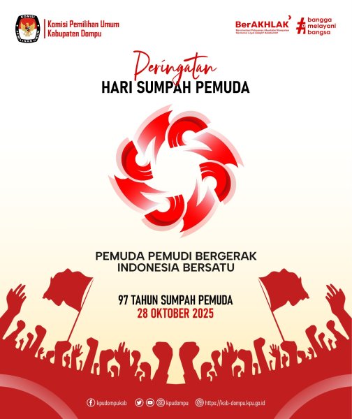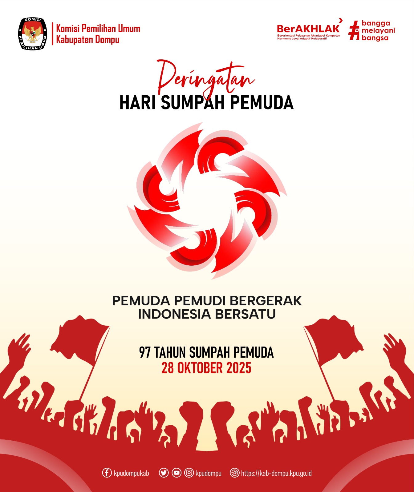 Segenap jajaran Komisi Pemilihan Umum Kabupaten Dompu mengucapkan selamat Hari Sumpah Pemuda Ke-97 Tahun, 28 Oktober 2025. "Pemuda Pemudi Bergerak Indonesia Bersatu".