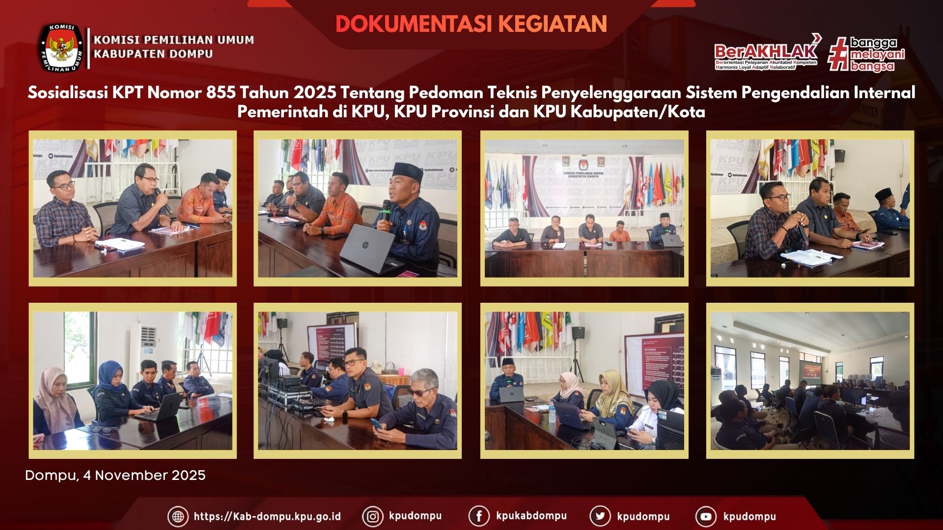 Komisi Pemilihan Umum (KPU) Kabupaten Dompu melaksanakan sosialisasi Keputusan Komisi Pemilihan Umum Nomor 855 Tahun 2025 tentang Pedoman Teknis Penyelenggaraan Sistem Pengendalian Internal Pemerintah (SPIP) di lingkungan KPU, KPU Provinsi, dan KPU Kabupaten/Kota.
