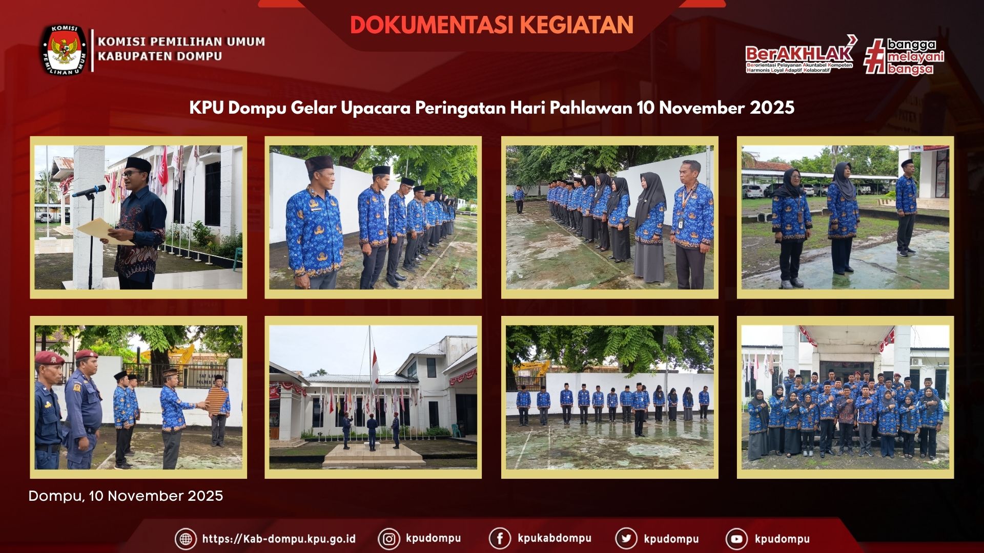 Komisi Pemilihan Umum (KPU) Kabupaten Dompu menggelar Upacara Peringatan Hari Pahlawan 10 November 2025 yang berlangsung khidmat di halaman kantor KPU Dompu, Jl. Bhayangkara Nomor 06, Senin (10/11/2025).