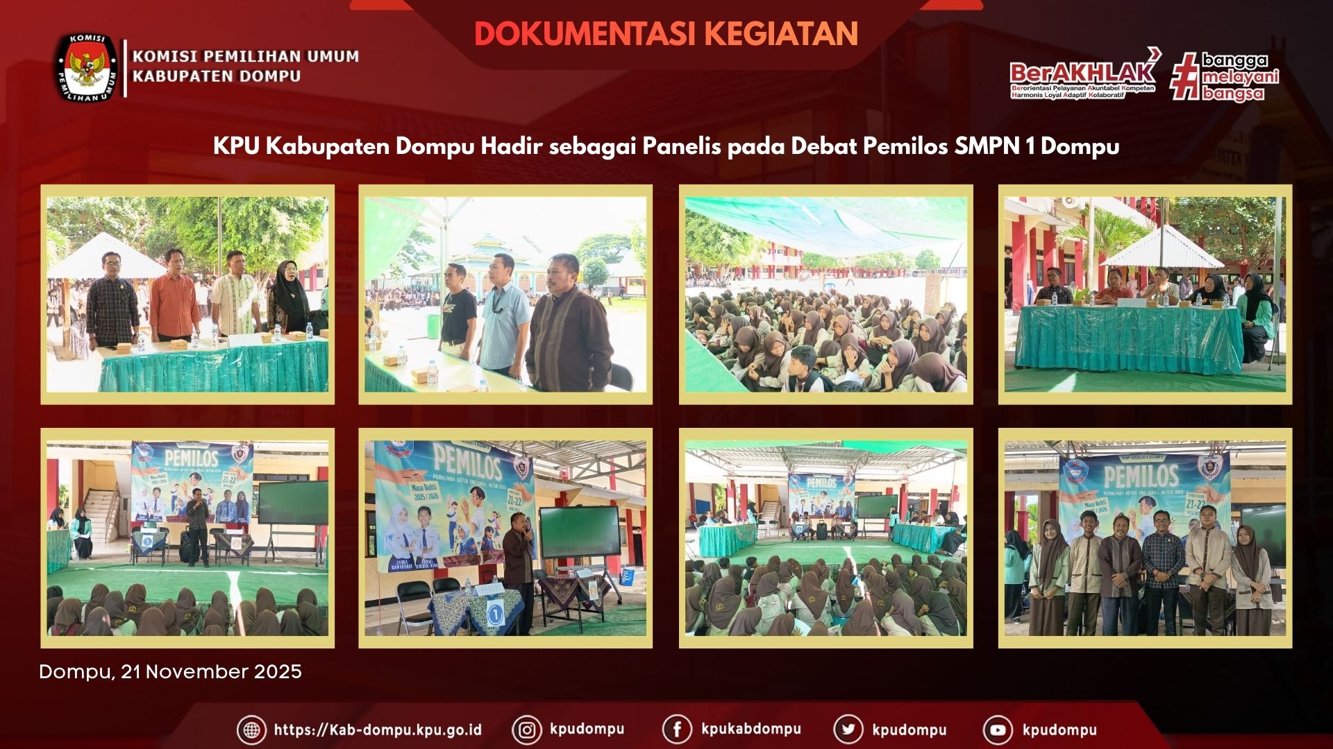 Kadiv Hukum dan Pengawasan KPU Kabupaten Dompu Maman Apriansyah hadir sebagai panelis dalam kegiatan Debat Pemilihan Ketua OSIS (Pemilos) di SMPN 1 Dompu pada Jumat, (21/11/2025), didampingi oleh Kasubbag Partisipasi Masyarakat dan SDM, Abu Hasan Taqwa serta dua orang staf pengelola Kehumasan.