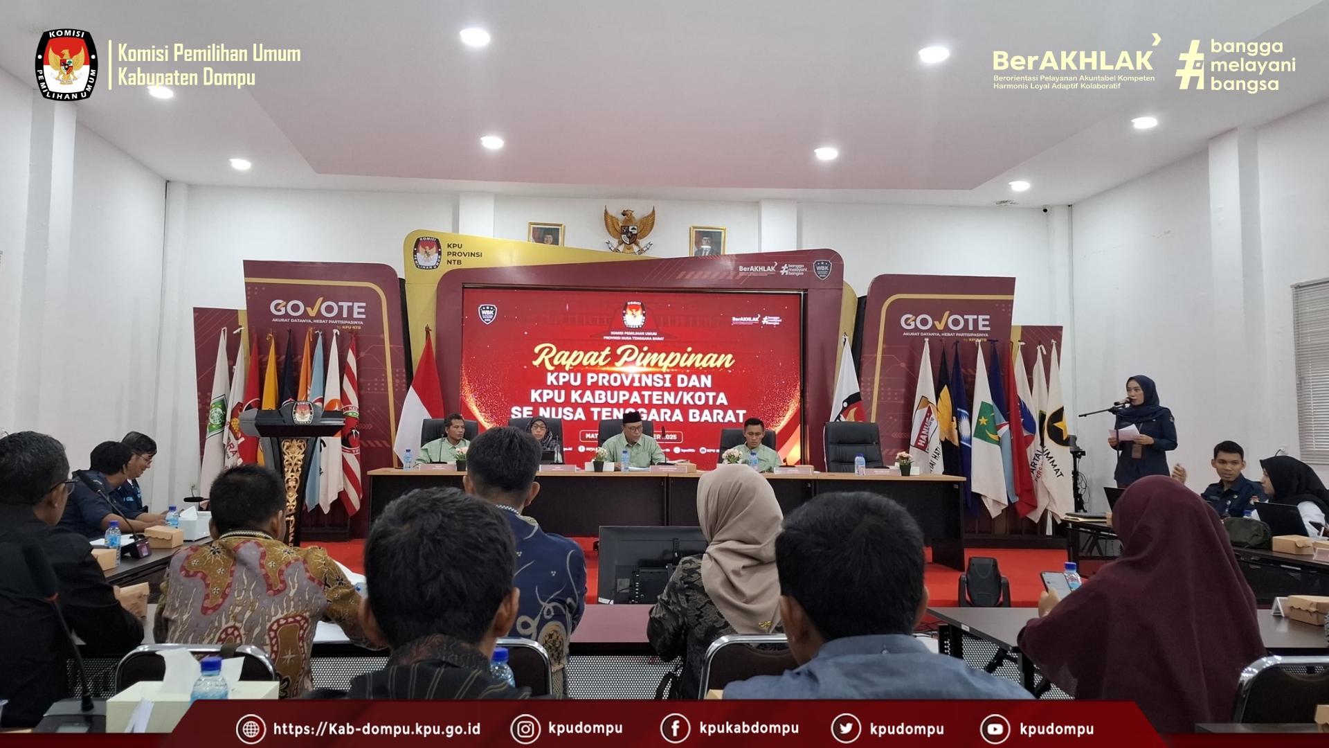 #TemanPemilih. Pada Minggu, (14/12/2025), Komisi Pemilihan Umum (KPU) Kabupaten Dompu mengikuti kegiatan Rapat Pimpinan (Rapim) yang diselenggarakan oleh KPU Provinsi Nusa Tenggara Barat (NTB). Kegiatan tersebut berlangsung di Aula Gedung B KPU Provinsi NTB dan dihadiri oleh seluruh pimpinan KPU kabupaten/kota se-NTB.