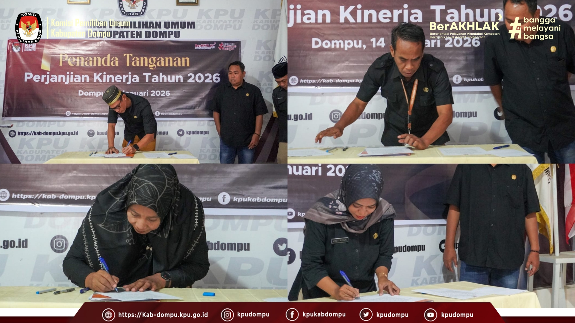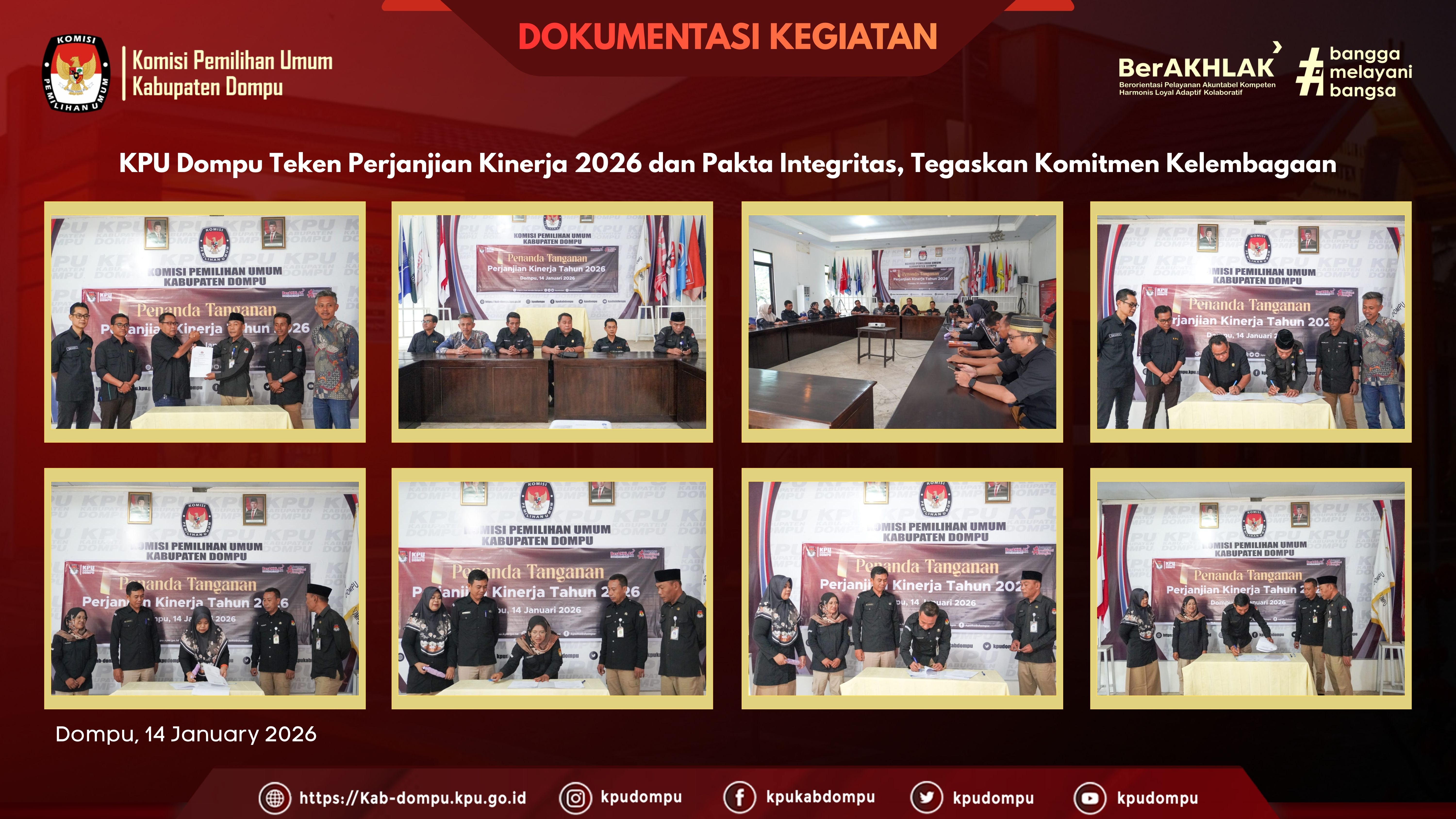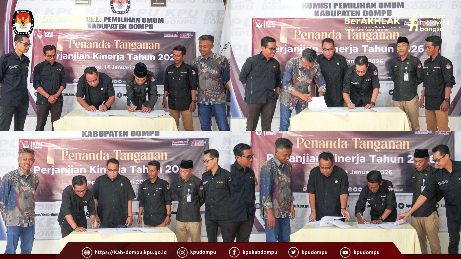 #TemanPemilih.Komisi Pemilihan Umum (KPU) Kabupaten Dompu melaksanakan kegiatan Penandatanganan Perjanjian Kinerja Tahun 2026 dan Penandatanganan Pakta Integritas yang berlangsung di Kantor KPU Kabupaten Dompu, Rabu (14/1/2026). Kegiatan tersebut diikuti oleh seluruh jajaran pimpinan dan pegawai sebagai bentuk komitmen kolektif dalam mewujudkan tata kelola kelembagaan yang profesional, transparan, dan berintegritas.
