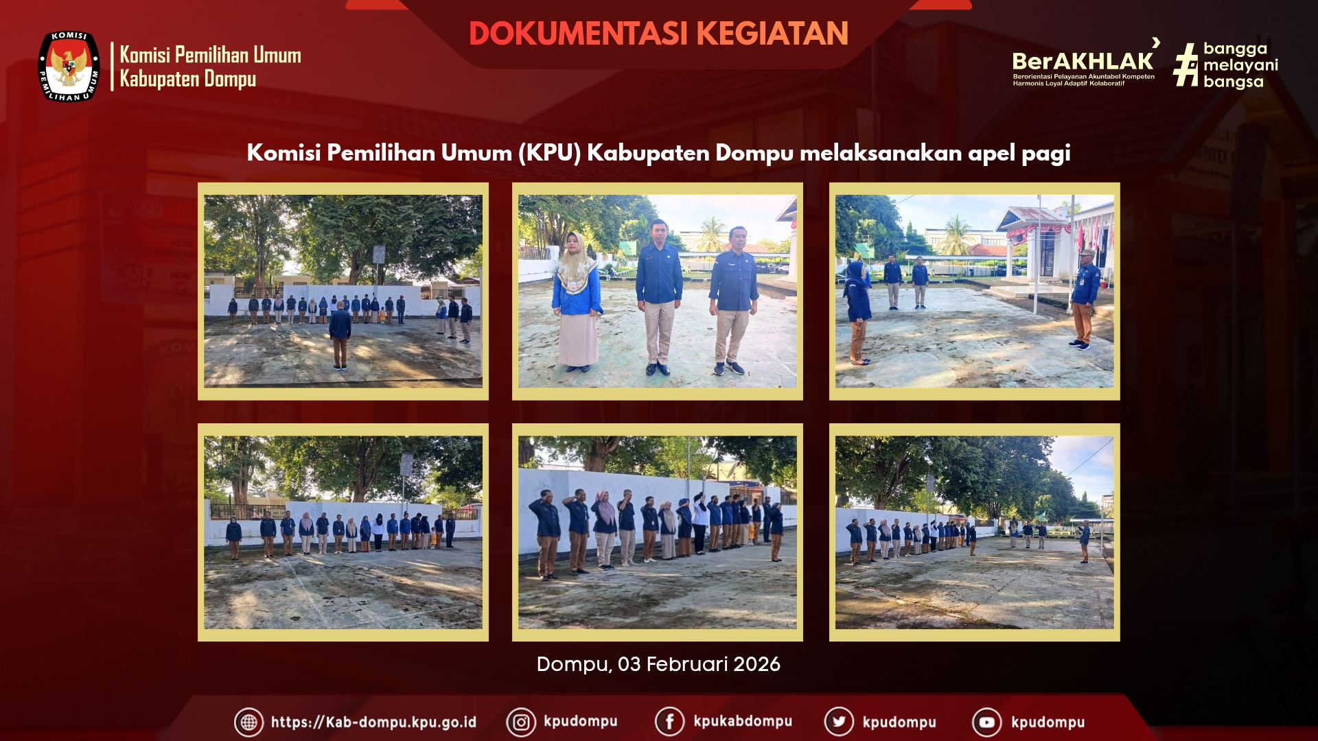 #TemanPemilih. Komisi Pemilihan Umum (KPU) Kabupaten Dompu melaksanakan apel pagi pada Selasa, (3/2/2026), yang berlangsung di Halaman Kantor KPU Kabupaten Dompu, Jalan Bhayangkara Nomor 06. Kegiatan tersebut menjadi momentum penting dalam memperkuat komitmen kedisiplinan dan tanggung jawab kerja seluruh jajaran sekretariat guna mendukung kinerja kelembagaan secara optimal.