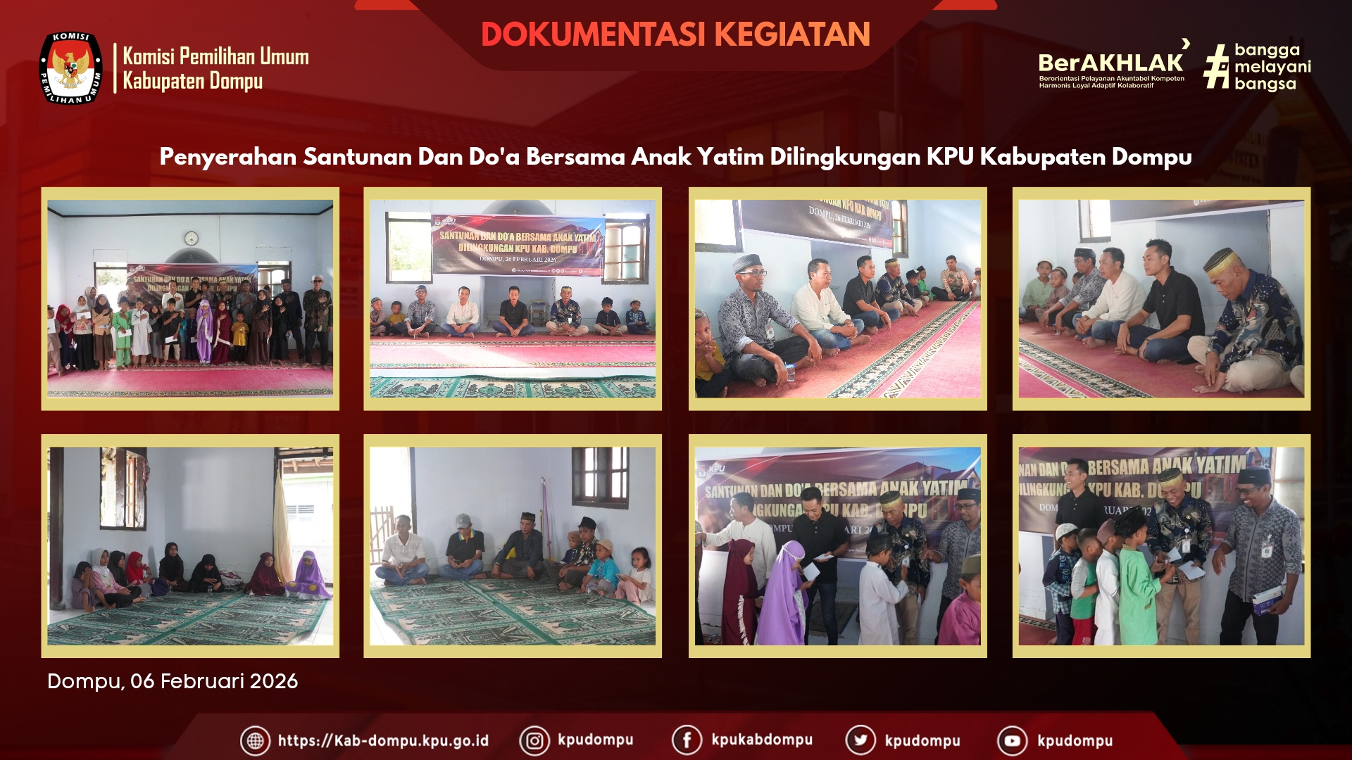 #TemanPemilih. Dalam rangka menumbuhkan kepedulian sosial terhadap generasi bangsa sekaligus mempererat tali silaturahmi dan meningkatkan soliditas internal, Komisi Pemilihan Umum (KPU) Kabupaten Dompu menggelar kegiatan KPU Peduli Anak Yatim dalam rangka menyambut Bulan Suci Ramadhan. Kegiatan tersebut dilaksanakan pada Jumat, (6/2/2026).