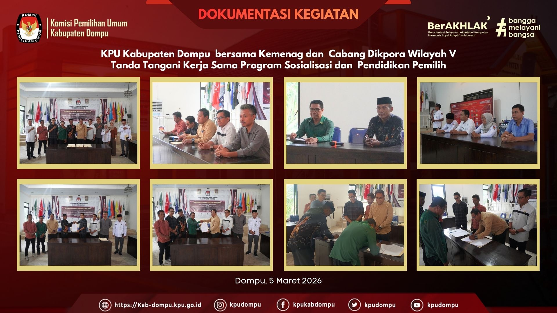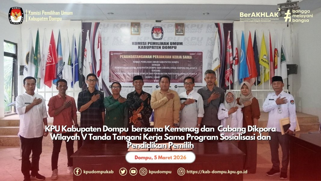 #TemanPemilih. Komisi Pemilihan Umum (KPU) Kabupaten Dompu menandatangani Perjanjian Kerja Sama (PKS) di bidang Sosialisasi Pendidikan Pemilih dan Peningkatan Partisipasi Pemilih Pemula bersama Kantor Kementerian Agama Kabupaten Dompu dan Kantor Cabang Dinas Dikpora Wilayah V Provinsi NTB, Rabu (5/3/2026), di Aula Kantor KPU Kabupaten Dompu.
