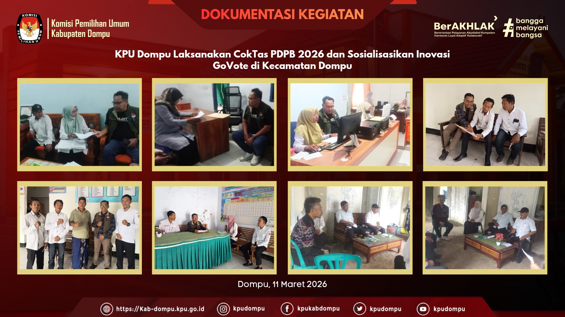 #TemanPemilih. Komisi Pemilihan Umum (KPU) Kabupaten Dompu melaksanakan kegiatan Pencocokan dan Penelitian Terbatas (CokTas) dalam rangka Pemutakhiran Data Pemilih Berkelanjutan (PDPB) Tahun 2026 di sejumlah desa dan kelurahan yang tersebar di wilayah Kecamatan Dompu, Rabu (11/3/2026).