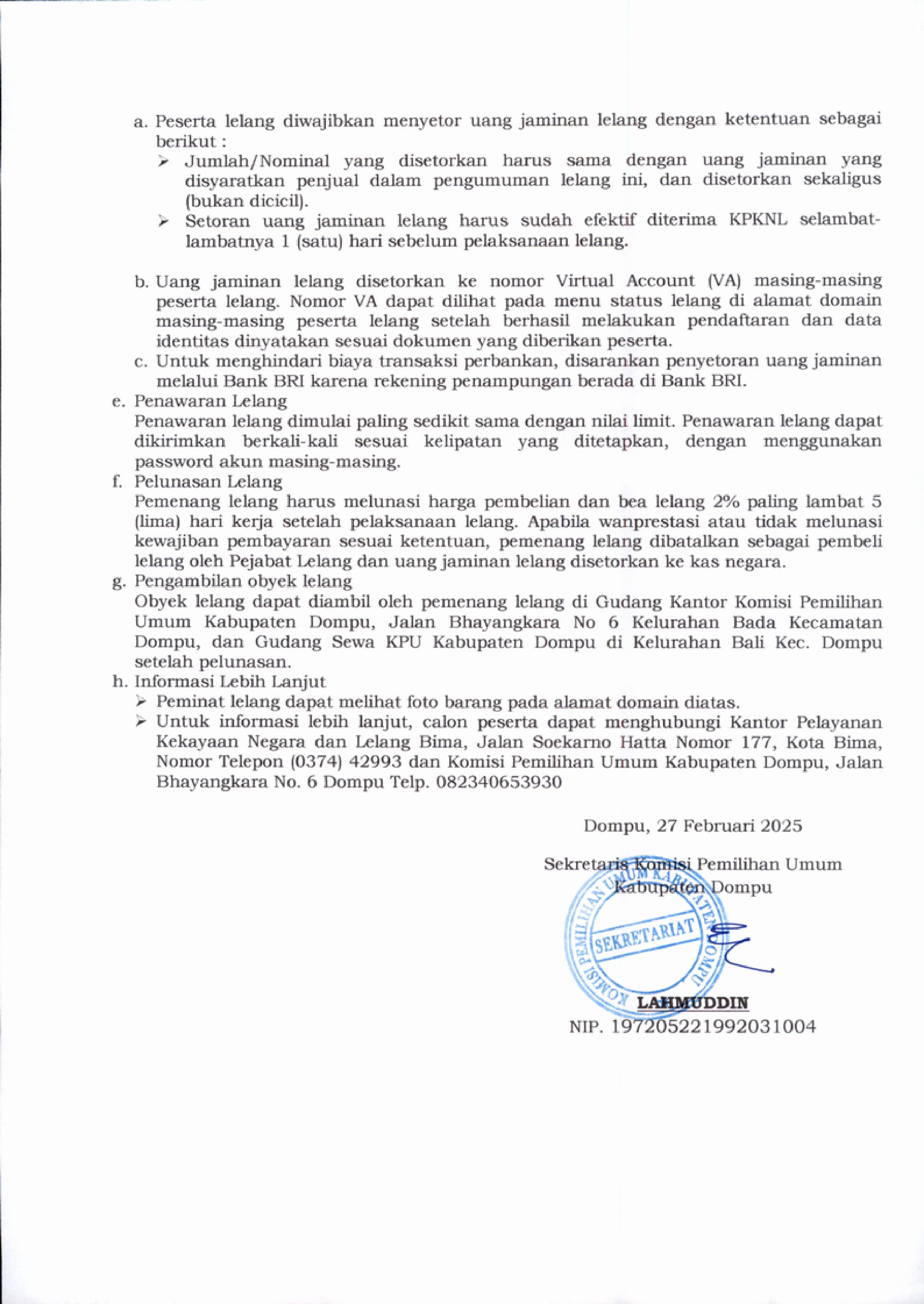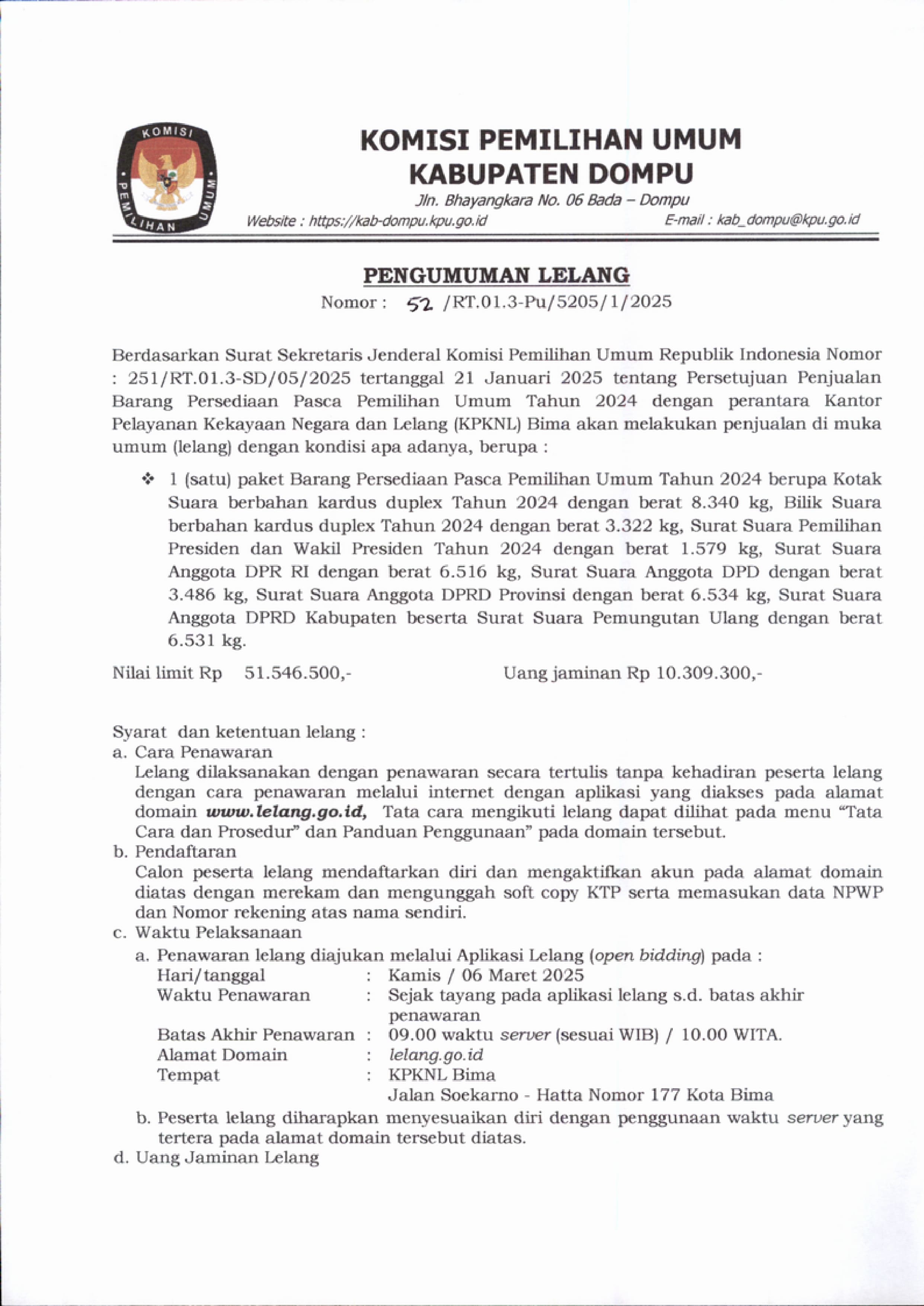 Berikut Kami Sampaikan Pengumuman Lelang Nomor : 52/RT.01.3-Pu/5205/1/2025 berupa 1 (satu) paket Barang Persediaan Pasca Pemilihan Umum Tahun 2024 berupa Kotak Suara berbahan kardus duplex Tahun 2024 dengan berat 8.340 kg, Bilik Suara berbahan kardus duplex Tahun 2024 dengan berat 3.322 kg, Surat Suara Pemilihan Presiden dan Wakil Presiden Tahun 2024 dengan berat 1.579 kg, Surat Suara Anggota DPR RI dengan berat 6.516 kg, Surat Suara Anggota DPD dengan berat 3.486 kg, Surat Suara Anggota DPRD Provinsi dengan berat 6.534 kg, Surat Suara Anggota DPRD Kabupaten beserta Surat Suara Pemungutan Ulang dengan berat 6.531 kg. dengan Nilai limit Rp. 51.546.500 (Lima Puluh Satu Juta Lima Ratus Empat Puluh Enam Ribu Lima Ratus) Uang Jaminan Rp. 10.309.300 (Sepuluh Juta Tiga Ratus Sembilan Ribu Tiga Ratus)