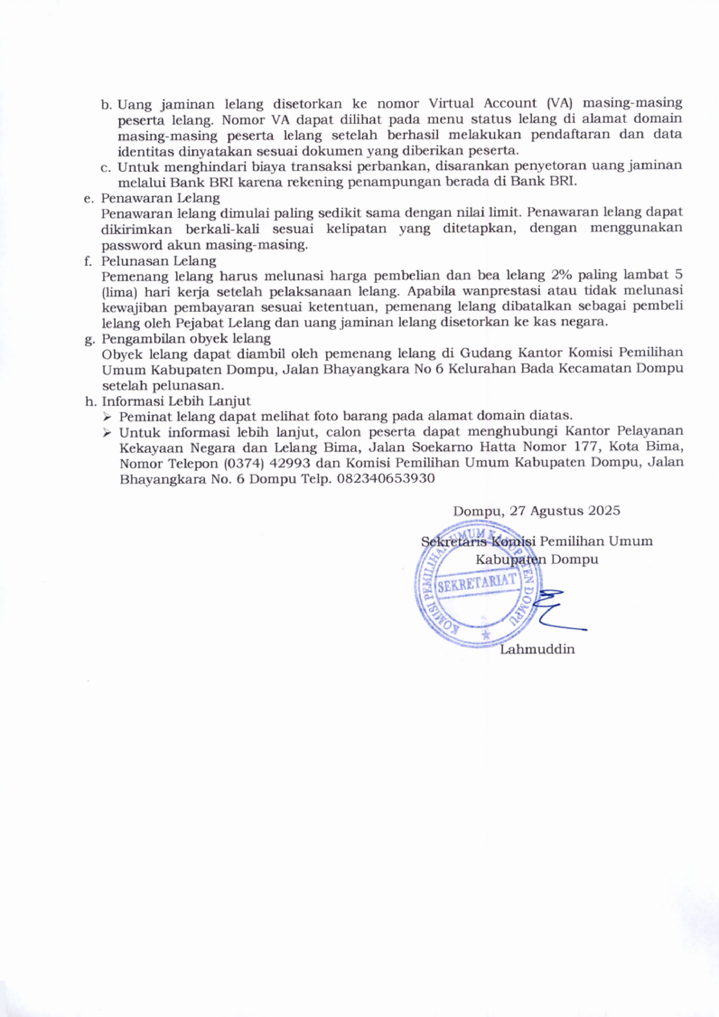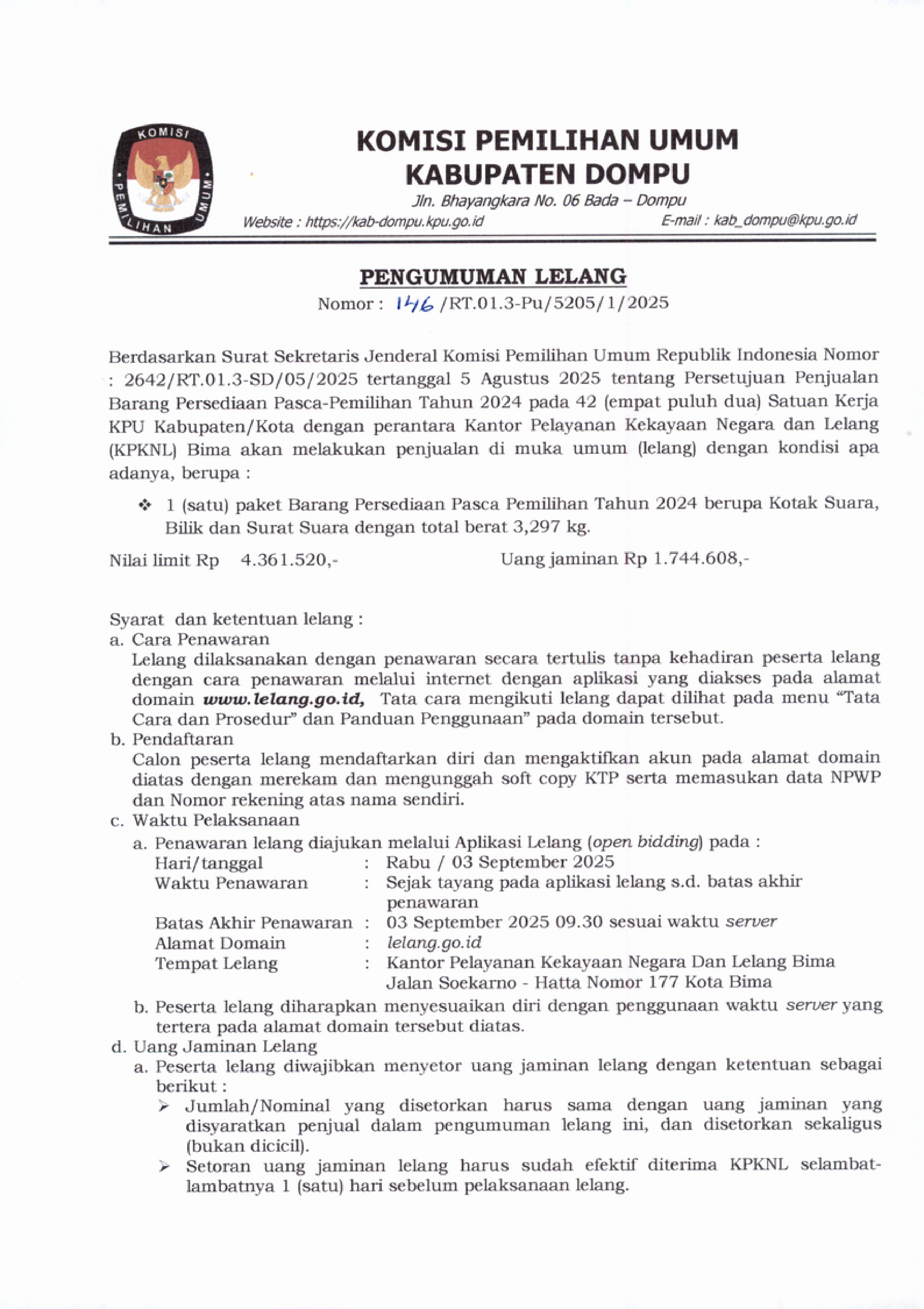Berdasarkan Surat Sekretaris Jenderal Komisi Pemilihan Umum Republik Indonesia Nomor : 2642/RT.01.3-SD/05/2025 tertanggal 5 Agustus 2025 tentang Persetujuan Penjualan Barang Persediaan Pasca-Pemilihan Tahun 2024 pada 42 (empat puluh dua) Satuan Kerja KPU Kabupaten/Kota dengan perantara Kantor Pelayanan Kekayaan Negara dan Lelang (KPKNL) Bima akan melakukan penjualan di muka umum (lelang) dengan kondisi apa adanya, berupa :