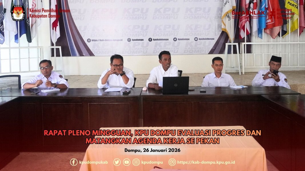 #TemanPemilih. Komisi Pemilihan Umum (KPU) Kabupaten Dompu menggelar Rapat Pleno Mingguan pada Senin (2/2/2026) bertempat di Ruang Aula Kantor KPU Kabupaten Dompu. Rapat dipimpin langsung oleh Ketua KPU Kabupaten Dompu, Arif Rahman, dan dihadiri oleh para Anggota KPU yakni Maman Apriansyah, Yusuf, Nasarudin, dan Hidayatullah, serta para Kepala Sub Bagian (Kasubbag) di lingkungan Sekretariat KPU Kabupaten Dompu. Rapat pleno mingguan tersebut difokuskan pada evaluasi progres pelaksanaan kegiatan yang telah dibahas pada pleno sebelumnya, sekaligus pemantapan agenda kerja yang akan dilaksanakan dalam satu pekan ke depan. Masing-masing divisi dan subbagian menyampaikan laporan capaian kegiatan, kendala yang dihadapi, serta langkah-langkah strategis guna memastikan seluruh program berjalan sesuai dengan perencanaan. Selain itu, rapat juga membahas rencana kunjungan silaturahmi kepada seluruh stakeholder penyelenggaraan pemilu. Kegiatan tersebut direncanakan sebagai bagian dari penguatan koordinasi dalam rangka pelaksanaan Pencocokan dan Penelitian Terbatas (Coktas) Daftar Pemilih Berkelanjutan (PDPB) Semester I Tahun 2026, dengan tujuan mewujudkan data pemilih yang akurat, mutakhir, dan komprehensif. Ketua KPU Kabupaten Dompu, Arif Rahman, dalam arahannya menegaskan pentingnya sinergi lintas stakeholder dalam setiap tahapan pemutakhiran data pemilih. Menurutnya, keberhasilan Coktas PDPB sangat bergantung pada koordinasi dan kerja sama yang baik dengan seluruh pihak terkait. “Coktas PDPB bukan sekadar kegiatan administratif, melainkan upaya strategis KPU untuk memastikan hak pilih masyarakat tetap terlindungi. Oleh karena itu, silaturahmi dan koordinasi dengan seluruh stakeholder menjadi kunci keberhasilan,” tegas Arif Rahman. Ia juga mengingatkan seluruh jajaran KPU Kabupaten Dompu untuk menjaga konsistensi kinerja serta disiplin dalam menindaklanjuti hasil rapat pleno, sehingga seluruh agenda kerja mingguan dapat terlaksana secara optimal. Sementara itu, para Anggota KPU Kabupaten Dompu menyampaikan berbagai masukan dan tanggapan, khususnya terkait penguatan peran divisi dalam mendukung pelaksanaan Coktas PDPB serta pentingnya pemetaan potensi kendala di lapangan. Masukan tersebut diarahkan agar setiap kegiatan dilengkapi dengan mitigasi risiko dan langkah antisipatif yang jelas. Para Kasubbag turut menyampaikan laporan teknis serta kesiapan sekretariat dalam mendukung agenda kerja KPU Kabupaten Dompu, baik dari aspek administrasi, logistik, maupun sumber daya manusia. Seluruh peserta rapat menegaskan komitmen bersama untuk terus meningkatkan koordinasi internal demi kelancaran pelaksanaan seluruh tahapan kegiatan. Melalui rapat pleno mingguan ini, KPU Kabupaten Dompu menegaskan komitmennya untuk terus melakukan evaluasi berkelanjutan dan pemantapan program kerja sebagai bagian dari upaya mewujudkan penyelenggaraan pemilu yang profesional, transparan, dan berintegritas, sekaligus mengoptimalkan implementasi program Go Vote dalam mendekatkan akses masyarakat terhadap proses Pemutakhiran Data Pemilih Berkelanjutan.