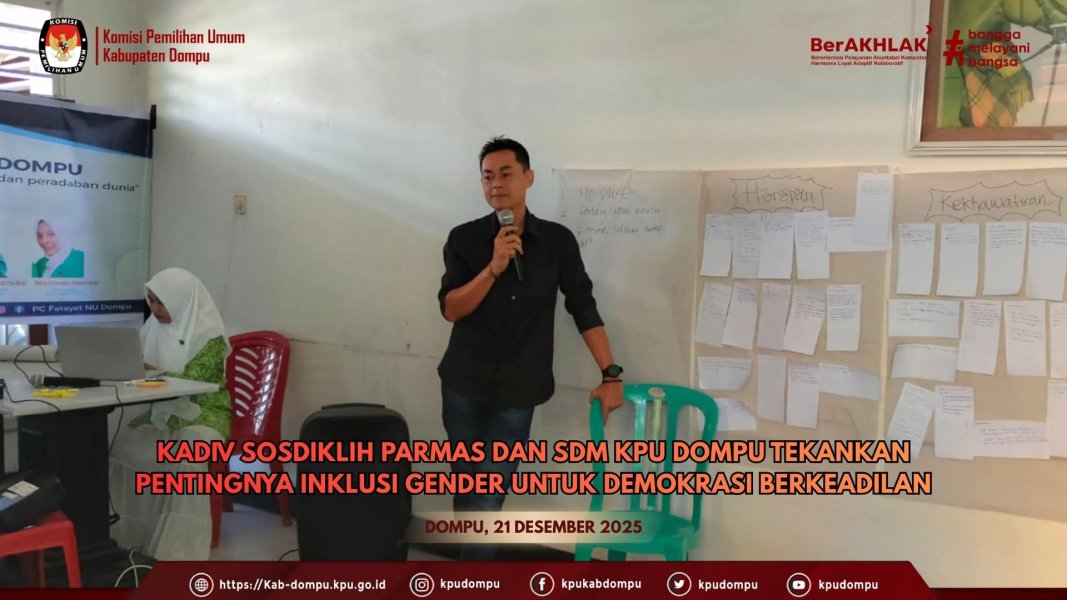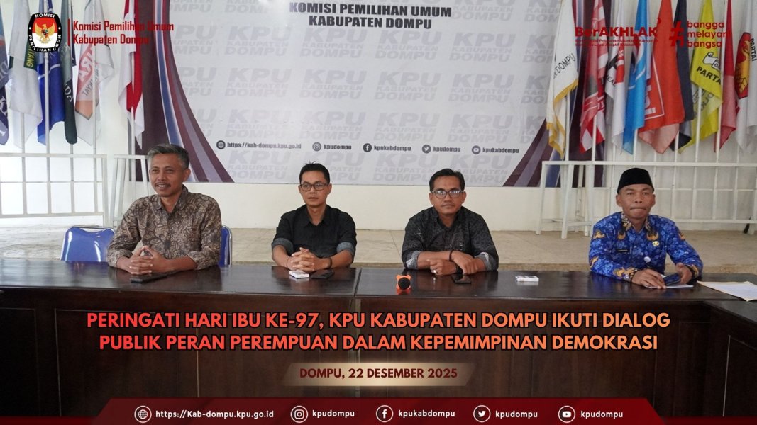 #TemanPemilih. Bertepatan dengan peringatan Hari Ibu ke-97 Tahun 2025, Komisi Pemilihan Umum (KPU) Kabupaten Dompu mengikuti Dialog Publik bertema “Perempuan Penggerak Perubahan, Perempuan Pemimpin Demokrasi Berkembang”, yang diselenggarakan secara daring oleh KPU Republik Indonesia, Senin (23/12/2025). Kegiatan ini diikuti oleh jajaran pimpinan dan sekretariat KPU Kabupaten Dompu, antara lain Kadiv. Sosialisasi, Pendidikan Pemilih, Partisipasi Masyarakat dan SDM Yusuf, Kadiv. Hukum dan Pengawasan Maman Apriansyah, Kadiv. Teknis Penyelenggaraan Pemilu Hidayatullah, Sekretaris KPU Kabupaten Dompu Lahmuddin, para Kasubbag, serta seluruh staf sekretariat. Dialog publik tersebut menjadi bagian dari refleksi peringatan Hari Ibu sekaligus penegasan peran strategis perempuan dalam kepemimpinan demokrasi dan penyelenggaraan pemilu. Melalui forum ini, peserta memperoleh pembelajaran mengenai kontribusi nyata perempuan, khususnya perempuan penyelenggara pemilu, dalam memperkuat tata kelola kepemiluan yang demokratis, inklusif, dan berkeadilan. Mewakili Ketua KPU RI, Kadiv. Hukum dan Pengawasan KPU RI Iffa Rosita, dalam sambutannya menyampaikan apresiasi kepada seluruh peserta yang mengikuti kegiatan ini, baik secara luring maupun daring. Ia menegaskan bahwa dialog publik ini selaras dengan tema peringatan Hari Ibu Tahun 2025 sebagaimana tertuang dalam Surat Edaran Kementerian Pemberdayaan Perempuan dan Perlindungan Anak RI Nomor 4 Tahun 2025, yakni “Perempuan Berdaya, Berkarya Menuju Indonesia Emas 2045”. “Perempuan Indonesia bukan hanya pilar keluarga, tetapi juga pilar bangsa. Perempuan adalah pembawa nilai, penentu arah moral, sekaligus motor penggerak perubahan sosial. Ketika perempuan diberi ruang memimpin, demokrasi akan tumbuh lebih inklusif, partisipatif, dan berkeadilan,” tegasnya. Lebih lanjut disampaikan bahwa dalam praktik demokrasi Indonesia, keterlibatan perempuan menunjukkan kontribusi signifikan, khususnya pada Pemilu dan Pemilihan Tahun 2024. KPU mencatat tingkat partisipasi pemilih perempuan lebih tinggi dibandingkan pemilih laki-laki. “Ini menjadi modal sosial yang sangat kuat. Tantangan KPU ke depan adalah memastikan partisipasi perempuan terus meningkat melalui sosialisasi dan pendidikan pemilih yang berkelanjutan hingga ke tingkat paling bawah,” ujarnya. Momentum Hari Ibu, menurutnya, harus menjadi penguat komitmen bersama untuk terus mendorong kemajuan, perlindungan, dan pemenuhan hak-hak perempuan dalam seluruh aspek kehidupan demokrasi. Dialog publik ini turut menghadirkan narasumber dan moderator yang seluruhnya merupakan perempuan inspiratif dan berprestasi dari berbagai latar belakang. Kehadiran mereka diharapkan mampu memberikan wawasan, inspirasi, serta semangat bagi seluruh peserta dalam memperkuat peran perempuan sebagai penggerak perubahan dan pemimpin demokrasi yang berkelanjutan.