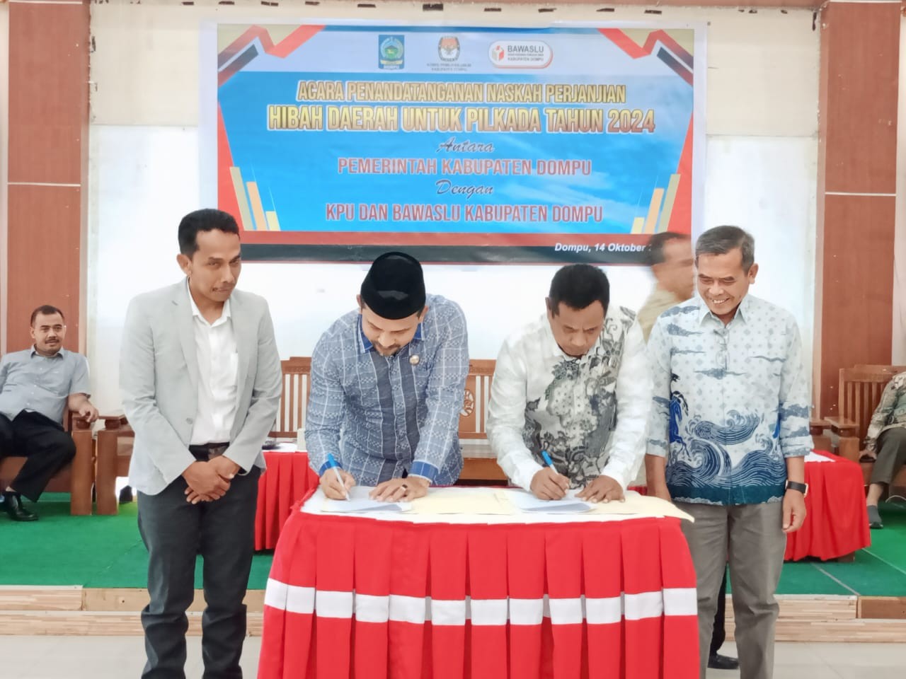 Selanjutnya atas pengajuan Anggaran yang telah dilakukan oleh KPU Kabupaten Dompu, hari ini Sabtu (14-10-2023), bertempat di Pendopo Bupati Dompu dilakukan Pendatanganan Naskah Perjanjian Hubah Daerah dalam rangka membiayai pelaksanaan tahapan Pilkada Dompu Tahun 2024, antara Pemerintah Kabupaten Dompu yang dilakukan langsung oleh Bupati Dompu H. Kader Jaelani, dengan KPU Kabupaten Dompu yang diwakili oleh Ketua KPU Kabupaten Dompu Drs, Arifuddin, yang disaksikan oleh Wakil Bupati Dompu, Anggota Forkopimda Kabupaten Dompu, Sekretaris Daerah Kabupaten Dompu, para Asisten Setda, Pimpinan Organisasi Perangkat Daerah yang tergabung dalam Tim Anggaran Pemerintah Kabupaten Dompu, Para Anggota KPU Kabupaten Dompu serta jajaran sekretariat, serta hadir pula Ketua dan Anggota Bawaslu Kabupaten Dompu, karena dalam waktu yang bersamaan juga ditandatangani NPHD Pilkada Dompu 2024 antara Pemerintah Kabupaten Dompu dan Bawaslu Kabupaten Dompu.