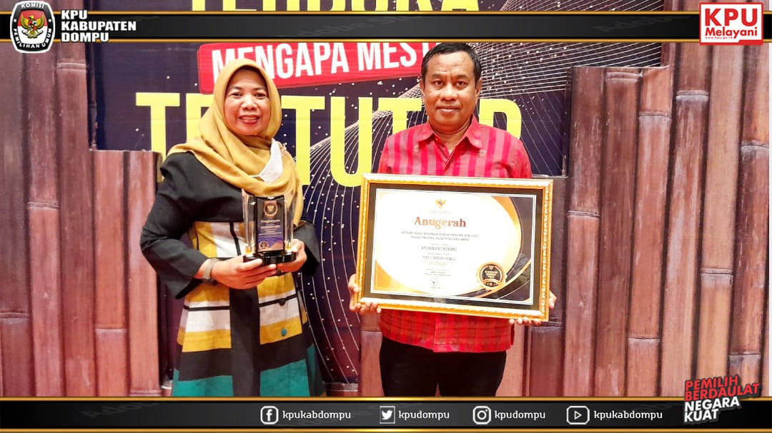Mataram - KPU Kab. Dompu dinobatkan sebagai peringkat 1 (INOVATIF) Badan Publik Penyelenggara Pemilu dalam penganugerahan Badan Publik Terbaik Dalam Menginplementasikan Undang- Undang Nomor 14 Tahun 2008 tentang Keterbukaan Informasi Publik, yang dilaksanakan oleh Komisi Informasi Provinsi NTB di Hotel Lombok Raya 19 Desember 2022 Ketua KPU Kab. Dompu, Drs. Arifuddin, menyampaikan rasa syukurnya Jelas penghargaan kepada KPU Kabupaten Dompu sebagai peringkat I (INFORMATIF) Badan Publik Penyelenggara Pemilu, dalam melaksanakan keterbukaan informasi di wilayah Provinsi Nusa Tenggara Barat "Terimakasih KPU Prov. NTB yang selalu memberikan semangat keterbukaan, serta terima kasih kepada anggota KPU Kab. Dompu, sekretaris dan seluruh staf sekretariat KPU Kab. Dompu yang telah menjadi Supertim dalam membangun keterbukaan informasi di jajaran KPU Kab. Dompu ". Ucap Arif. Bagi kami di KPU Kab. Dompu bahwa keterbukaan informasi menjadi aspek penting dalam memberikan legitimasi pemilu, karena setiap pemangku kepentingan di pemilu akan menerima hasil pemilu jika prinsip keterbukaan informasi diterapkan. Jelasnya. Lanjut Ketua KPU Kabupaten Dompu keterbukaan informasi di pemilu juga dapat mendorong partisipasi masyarakat dalam Pemilu 2024 tidak hanya dalam memberikan suaranya tapi juga mengawal proses penyelenggaraan pemilu dengan melakukan sosialisasi terkait Informasi yang dapat memastikan para pemilih dapat berpartisipasi aktif dalam pemilu, seperti informasi daftar pemilih, informasi hari pemungutan suara dan informasi mengenai partai dan informasi mengenai hasil pemilu, baik pemilu legislatif maupun pemilu presiden dengan tujuan membangun kepercayaan publik yang pada akhirnya memberikan legitimasi pemilu baik dari sisi proses maupun hasil pelaksanaan pemilu. Beber Arif.