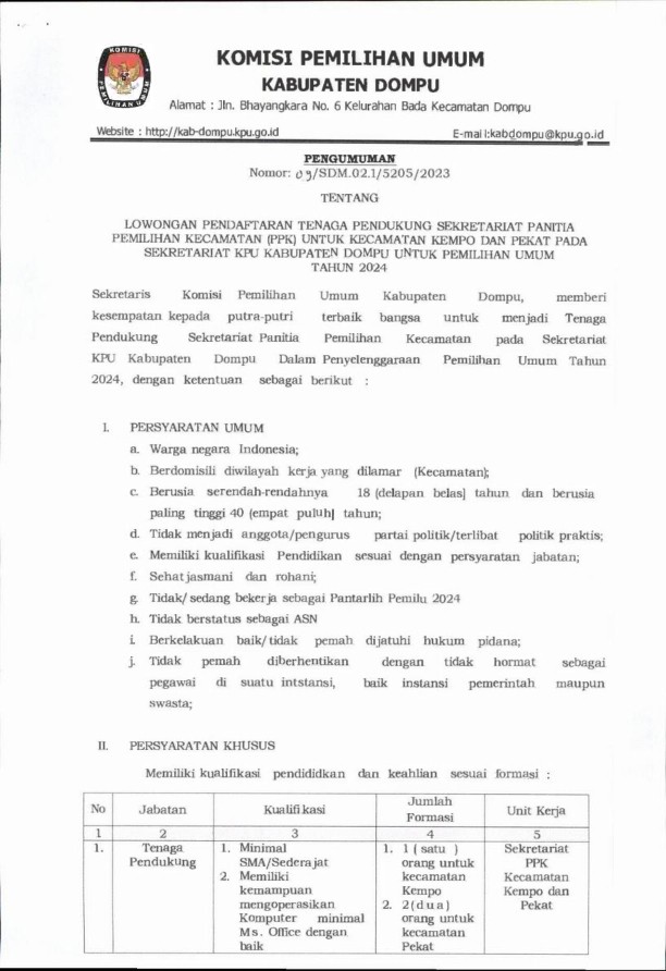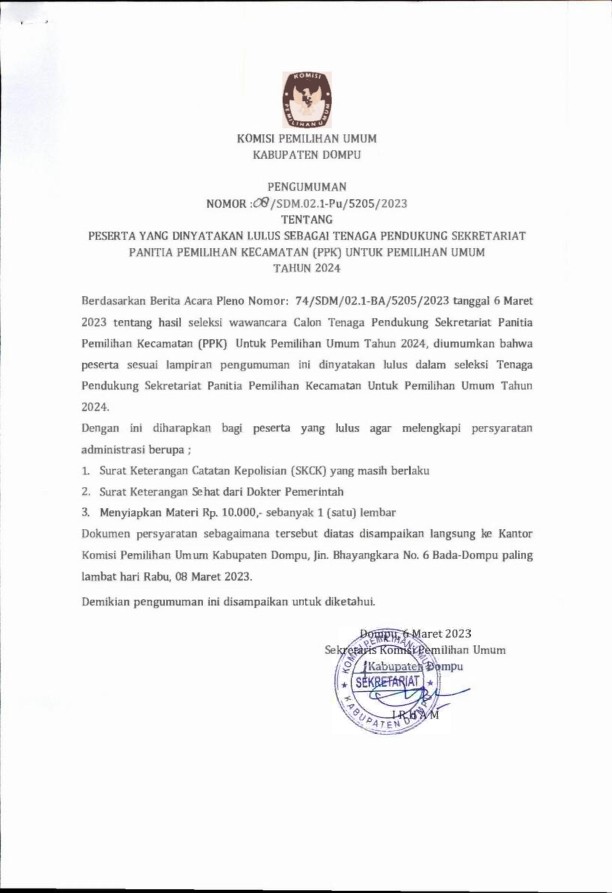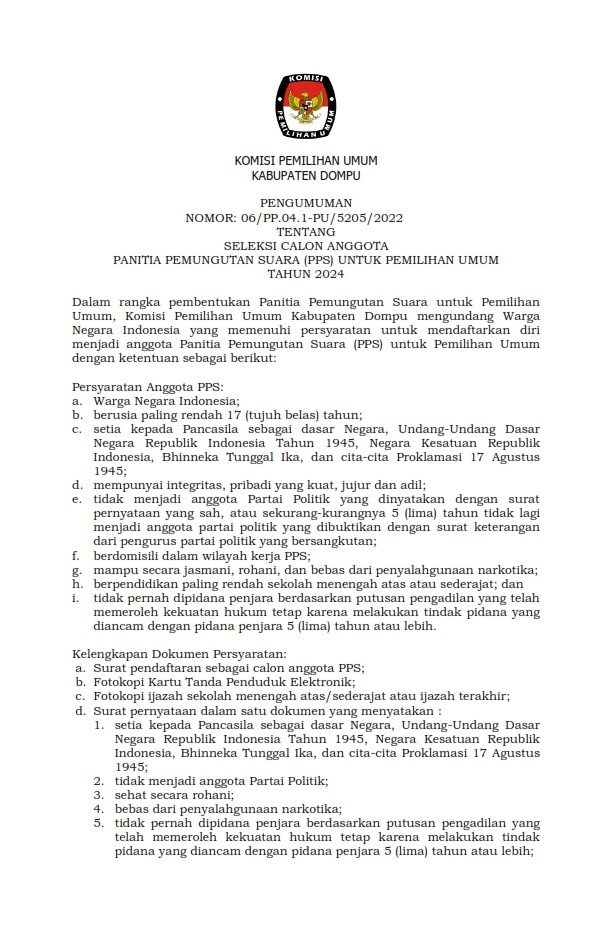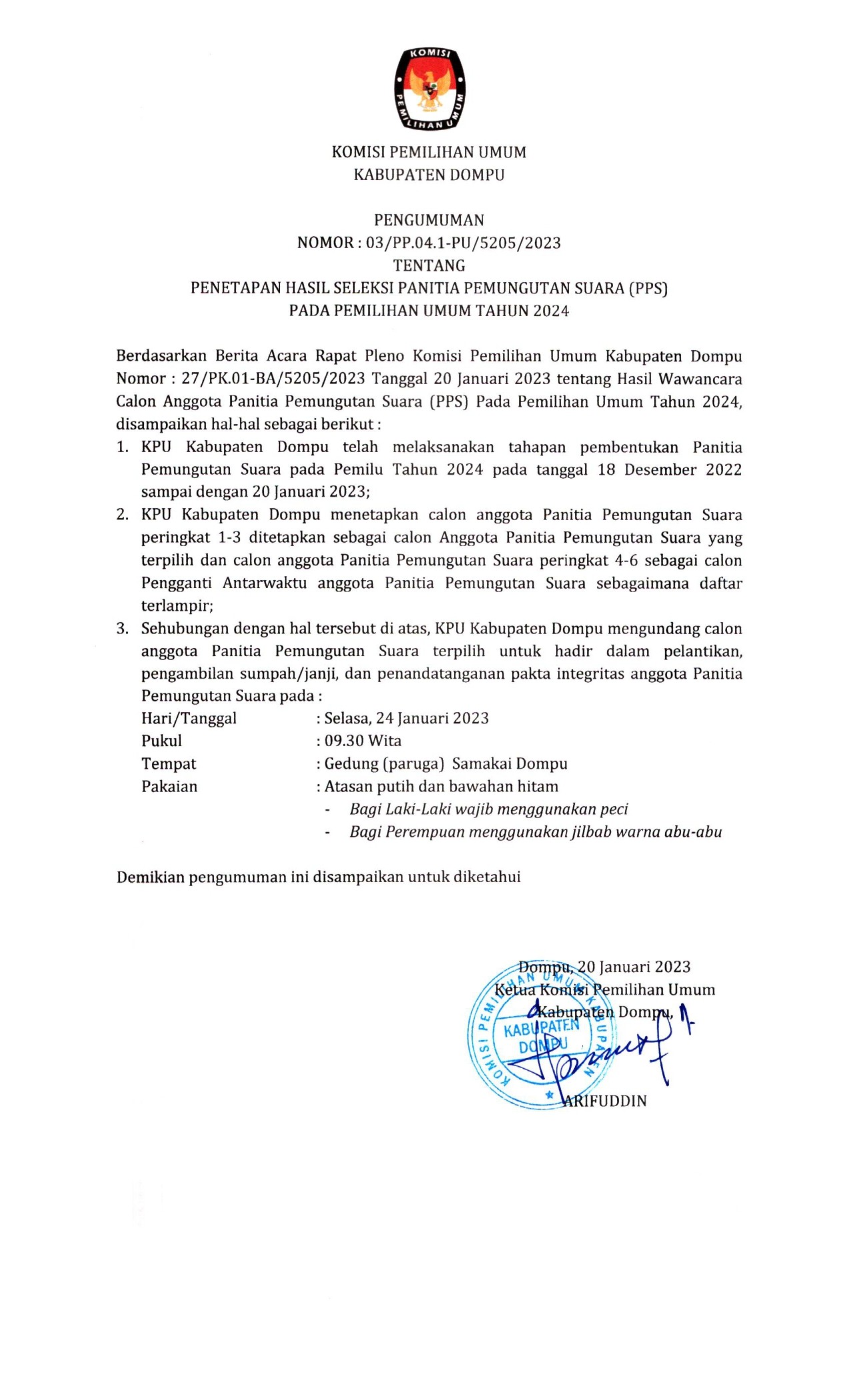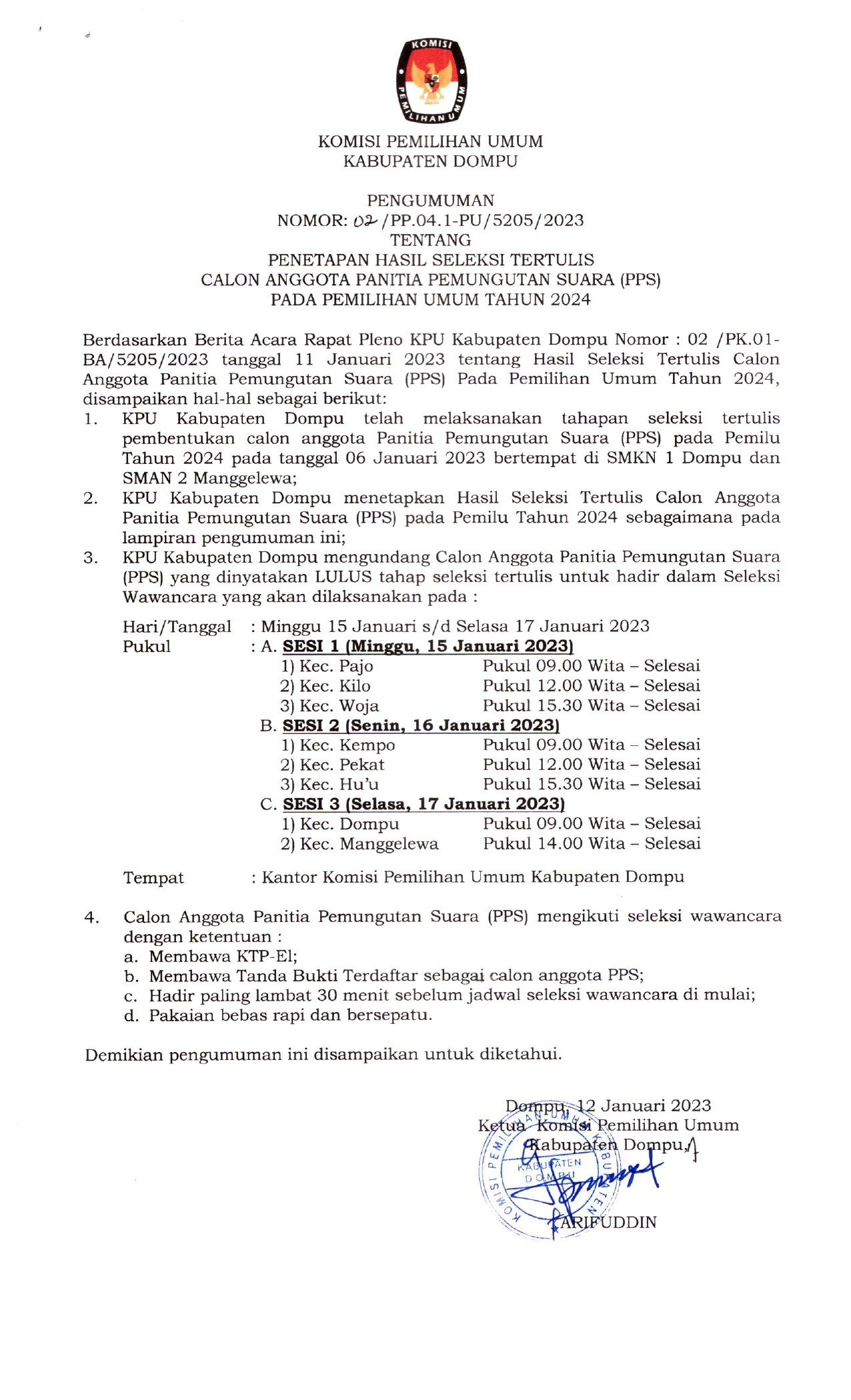 Berdasarkan Berita Acara Rapat Pleno Komisi Pemilihan Umum Kabupaten Dompu Nomor : 27/PK.01-BA/5205/2023 Tanggal 20 Januari 2023 tentang Hasil Wawancara Calon Anggota Panitia Pemungutan Suara (PPS) Pada Pemilihan Umum Tahun 2024, disampaikan hal-hal sebagai berikut :