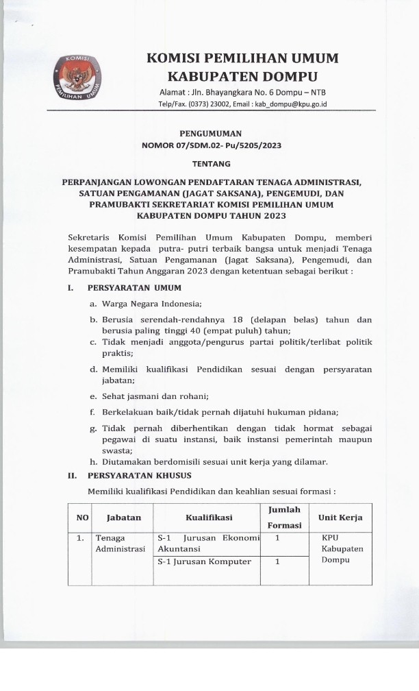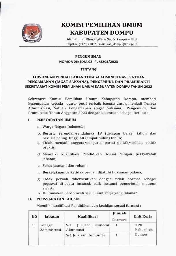 Sehubungan dengan hal tersebut di atas, KPU Kabupaten Dompu mengundang calon anggota Panitia Pemungutan Suara terpilih untuk hadir dalam pelantikan, pengambilan sumpah/janji, dan penandatanganan pakta integritas anggota Panitia Pemungutan Suara pada :