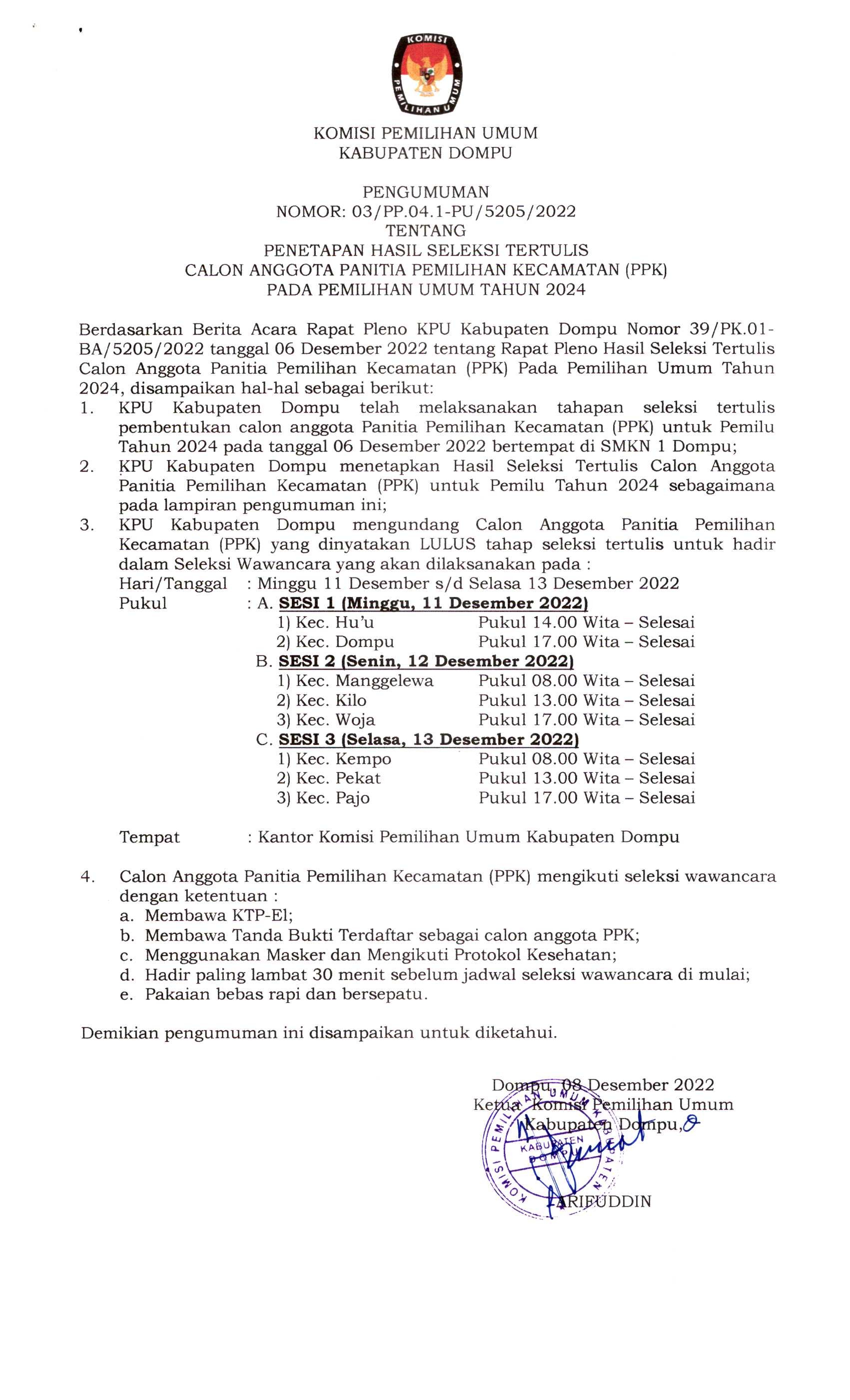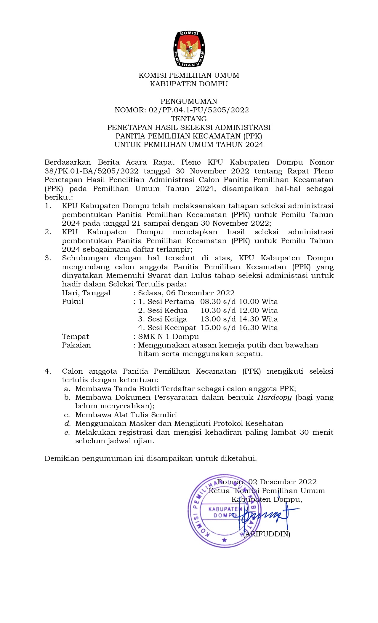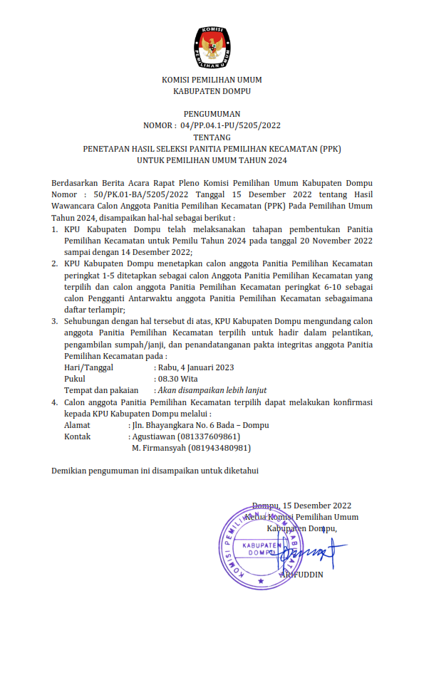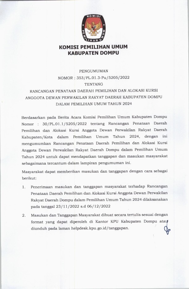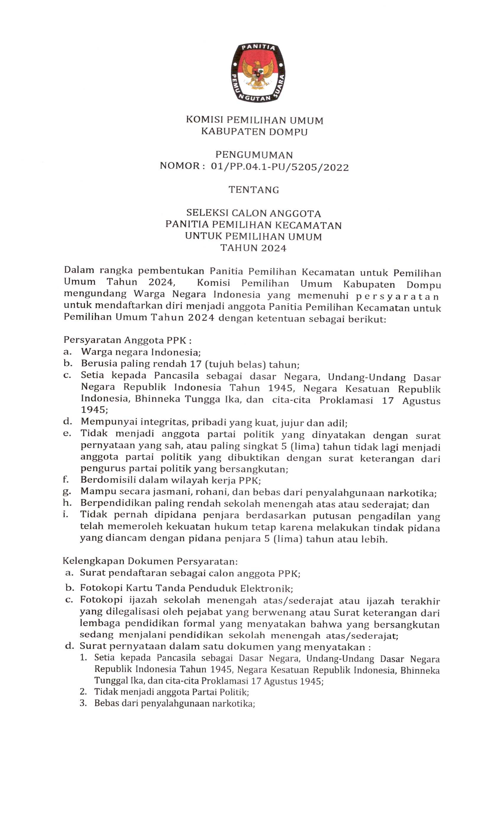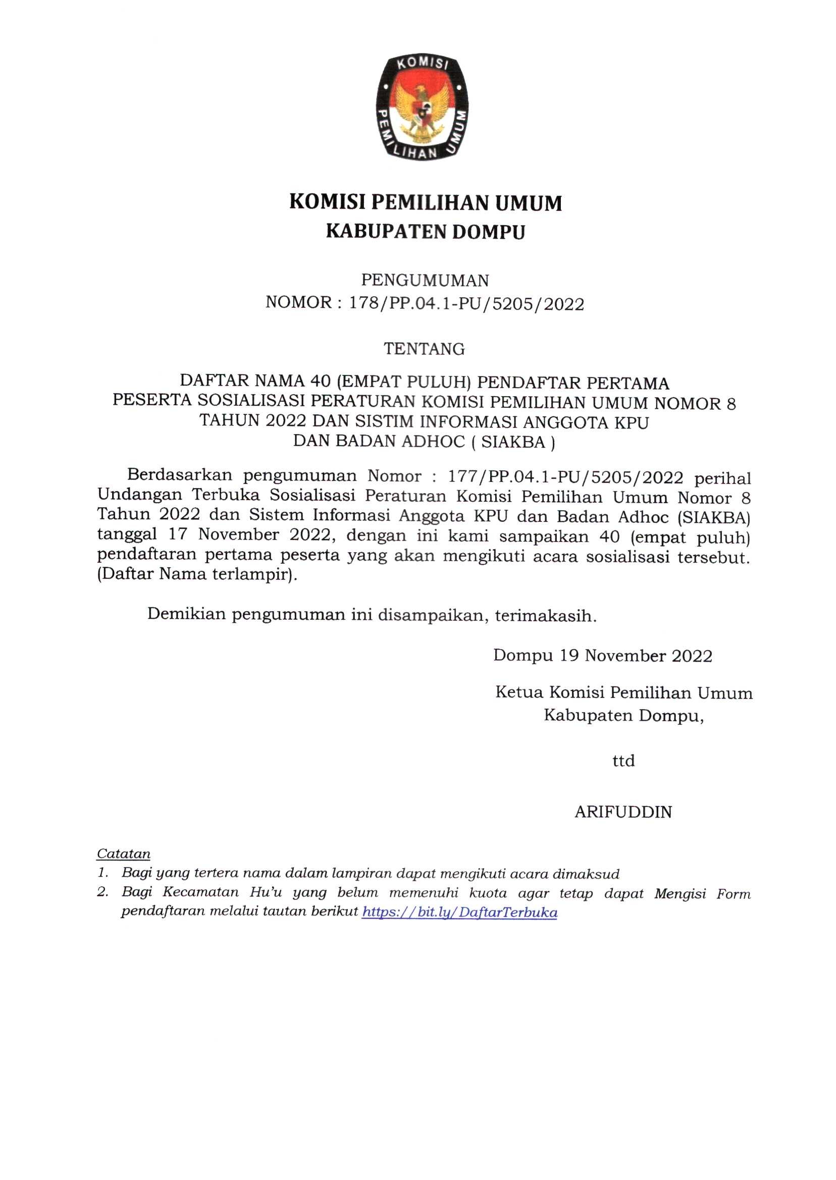 Komisi Pemilihan Umum Kabupaten Dompu mengeluarkan Pengumuman Nomor 178/PP.04.1-PU/5205/2022 tentang Daftar Nama 40 Pendaftar Pertama Peserta Sosialisasi PKPU No 8 Tahun 2022 dan Sistem Informasi Anggota KPU dan Badan Adhoc (SIAKBA)