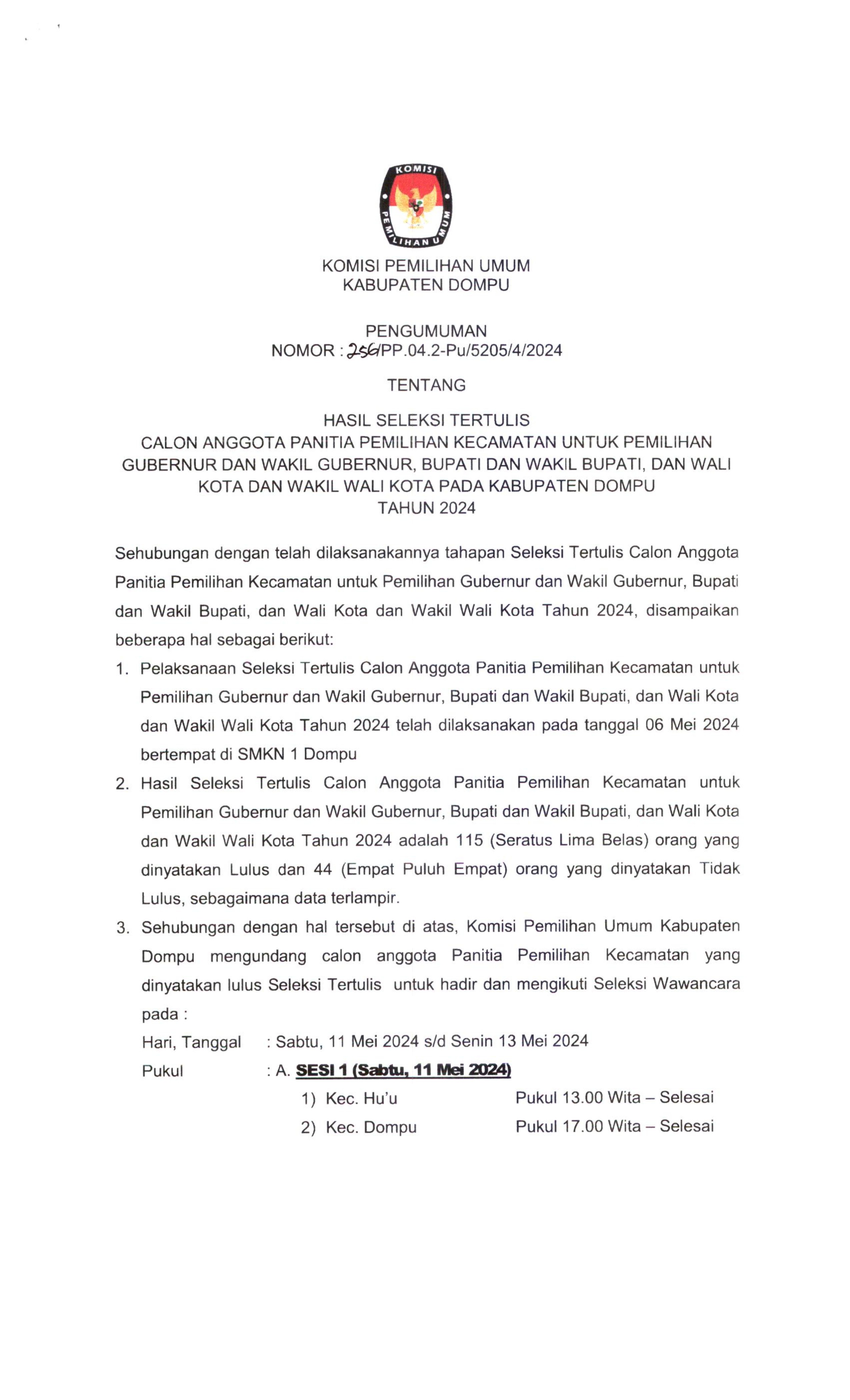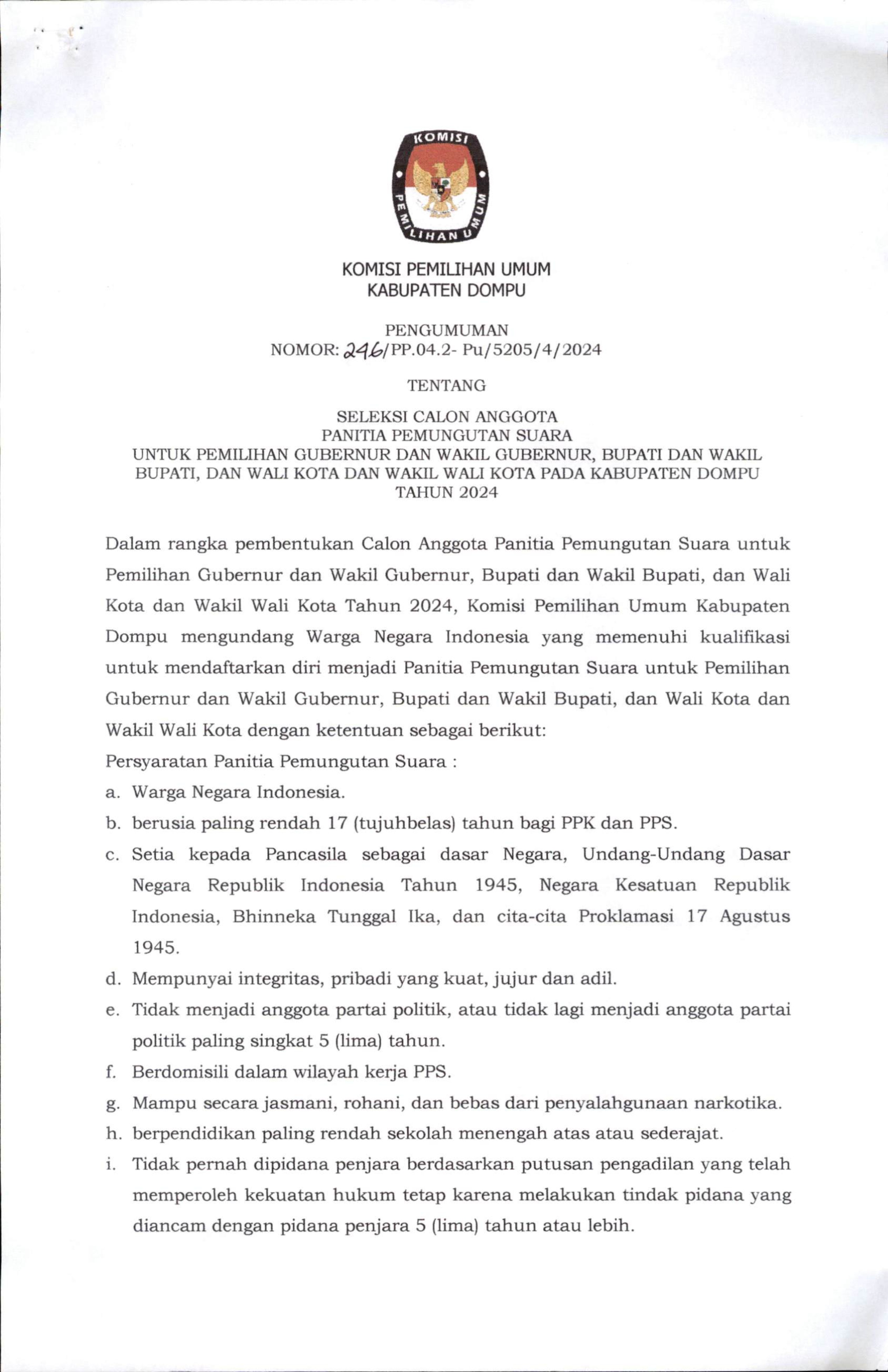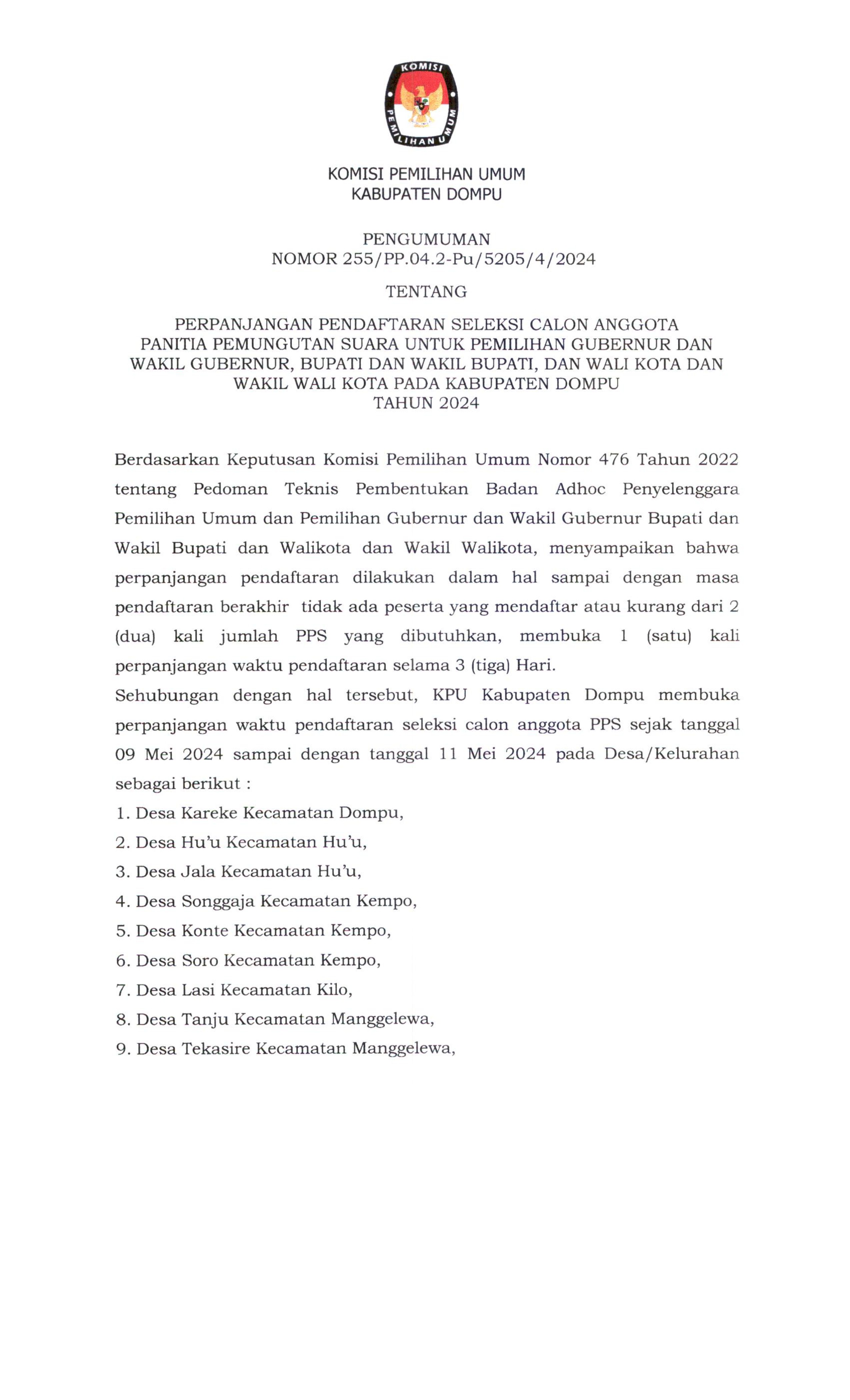 PERPANJANGAN PENDAFTARAN SELEKSI CALON ANGGOTA PANITIA PEMUNGUTAN SUARA UNTUK PEMILIHAN GUBERNUR DAN WAKIL GUBERNUR, BUPATI DAN WAKIL BUPATI, DAN WALI KOTA DAN WAKIL WALI KOTA PADA KABUPATEN DOMPU TAHUN 2024