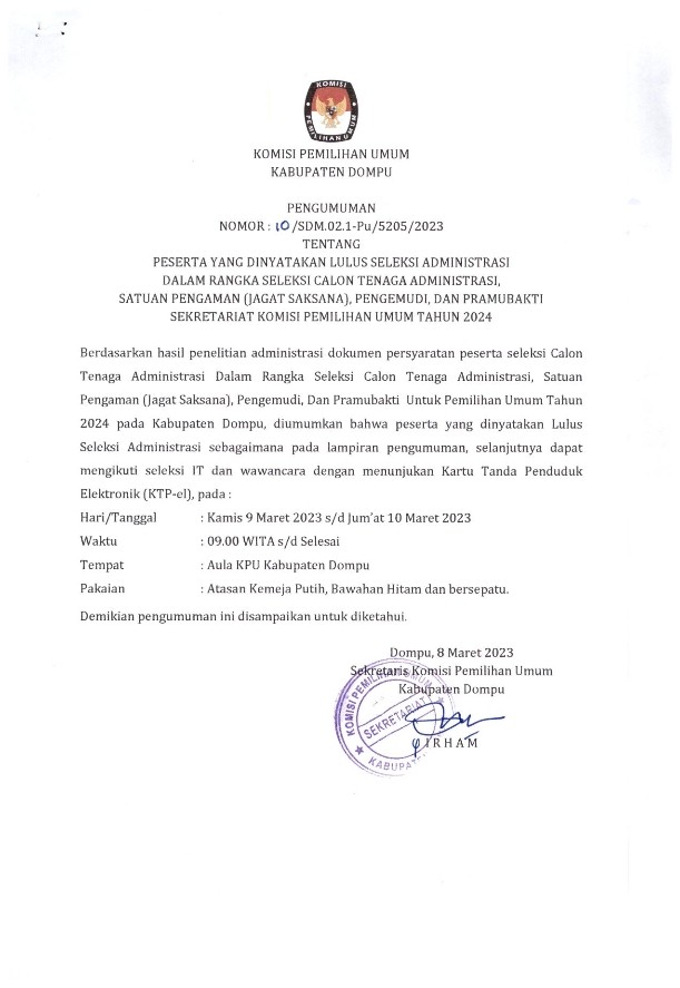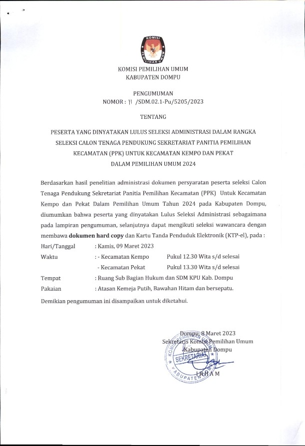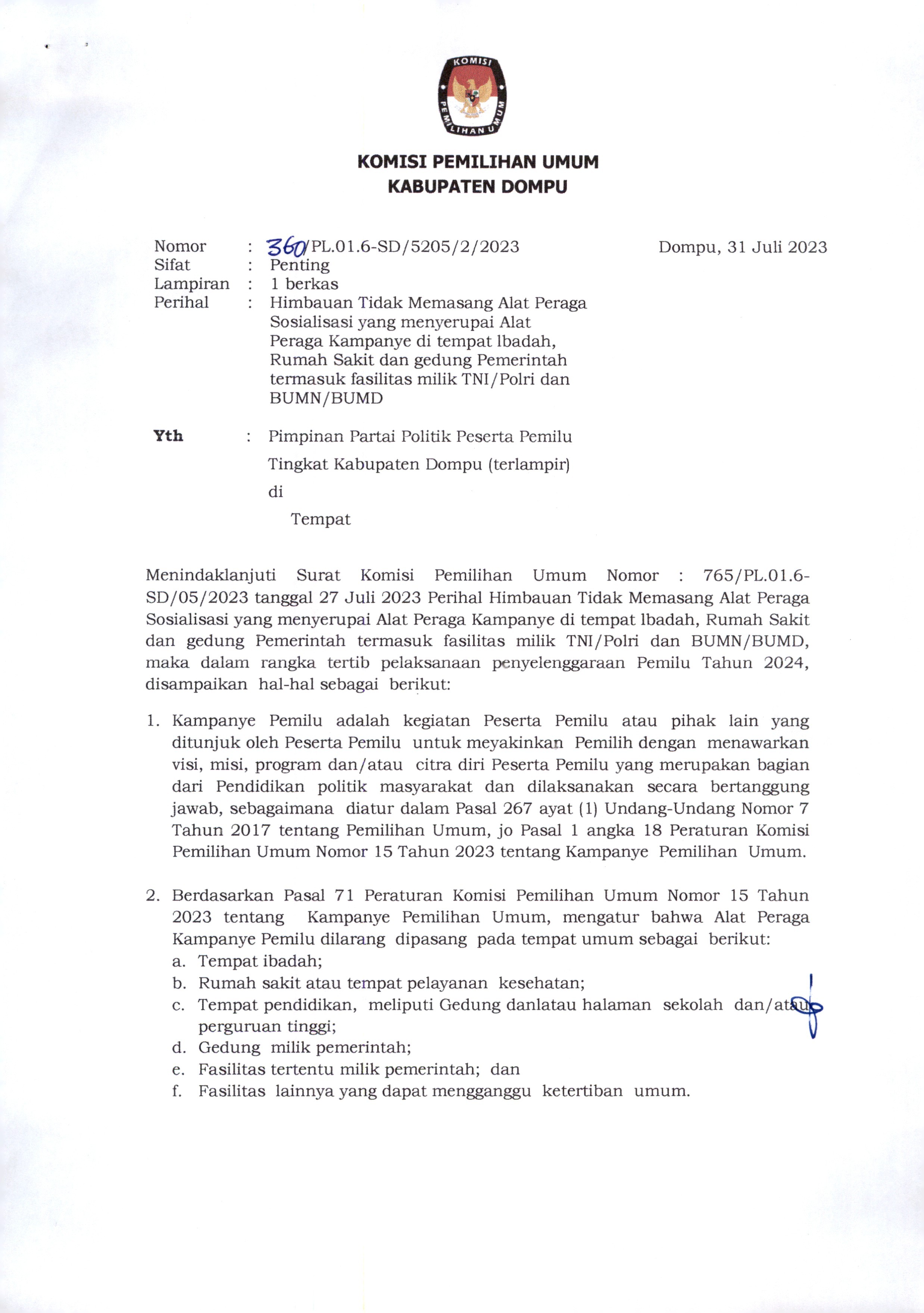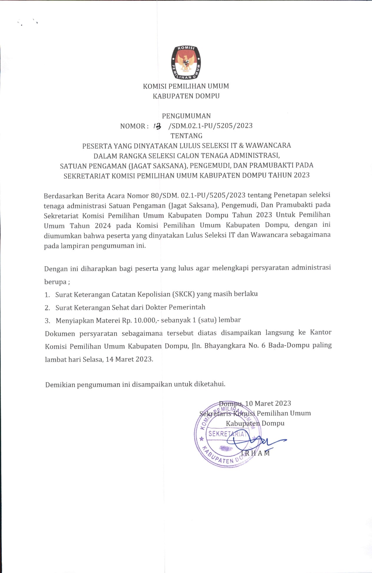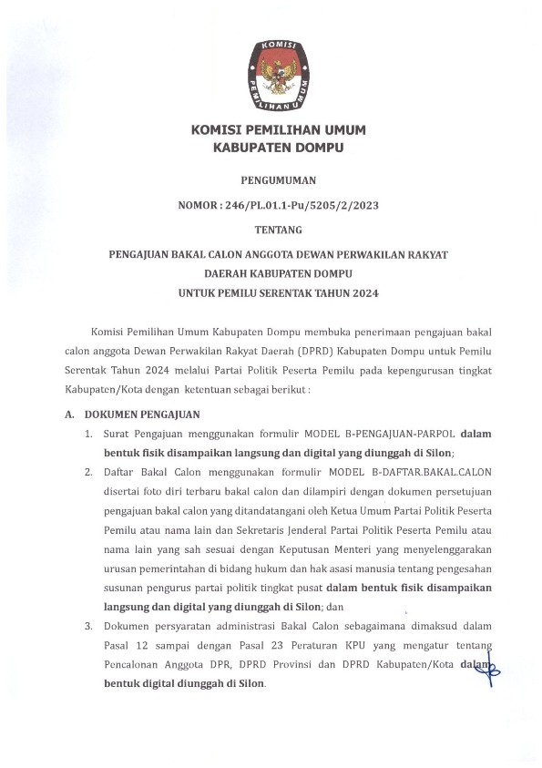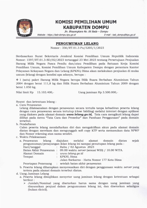 PENGUMUMAN LELANG Nomor : 356/RT.01.3-Pu/5205/1/2023 Berdasarkan Surat Sekretaris Jenderal Komisi Pemilihan Umum Republik Indonesia Nomor: 1597/RT.01.3-SD/02/2023 tertanggal 23 Mei 2023 tentang Persetujuan Penjualan Barang Milik Negara Pasca Pemilu dan/atau Pemilihan pada Satuaan Kerja Komisi Pemilihan Umum, Komisi Pemilihan Umum Kabupaten Dompu dengan perantara Kantor Pelayanan Kekayaan Negara dan Lelang (KPKNL) Bima akan melakukan penjualan di muka umum (lelang) dengan kondisi apa adanya, berupa : 1 (satu) paket Barang Milik Negara berupa Bilik Suara Berbahan Aluminium Tahun 2004 dengan berat 111,8 kg dan Bilik Suara Berbahan Aluminium Tahun 2009 dengan berat 1.050 kg. Nilai limit Rp 15.103.400,- Uang jaminan Rp 3.500.000,- Unduh Pengumuman https://kab-dompu.kpu.go.id/public/kab-dompu2/dmdocument/1690501258356 Pengumuman Lelang BMN Berupa Bilik Suara Berbahan Aluminium.pdf
